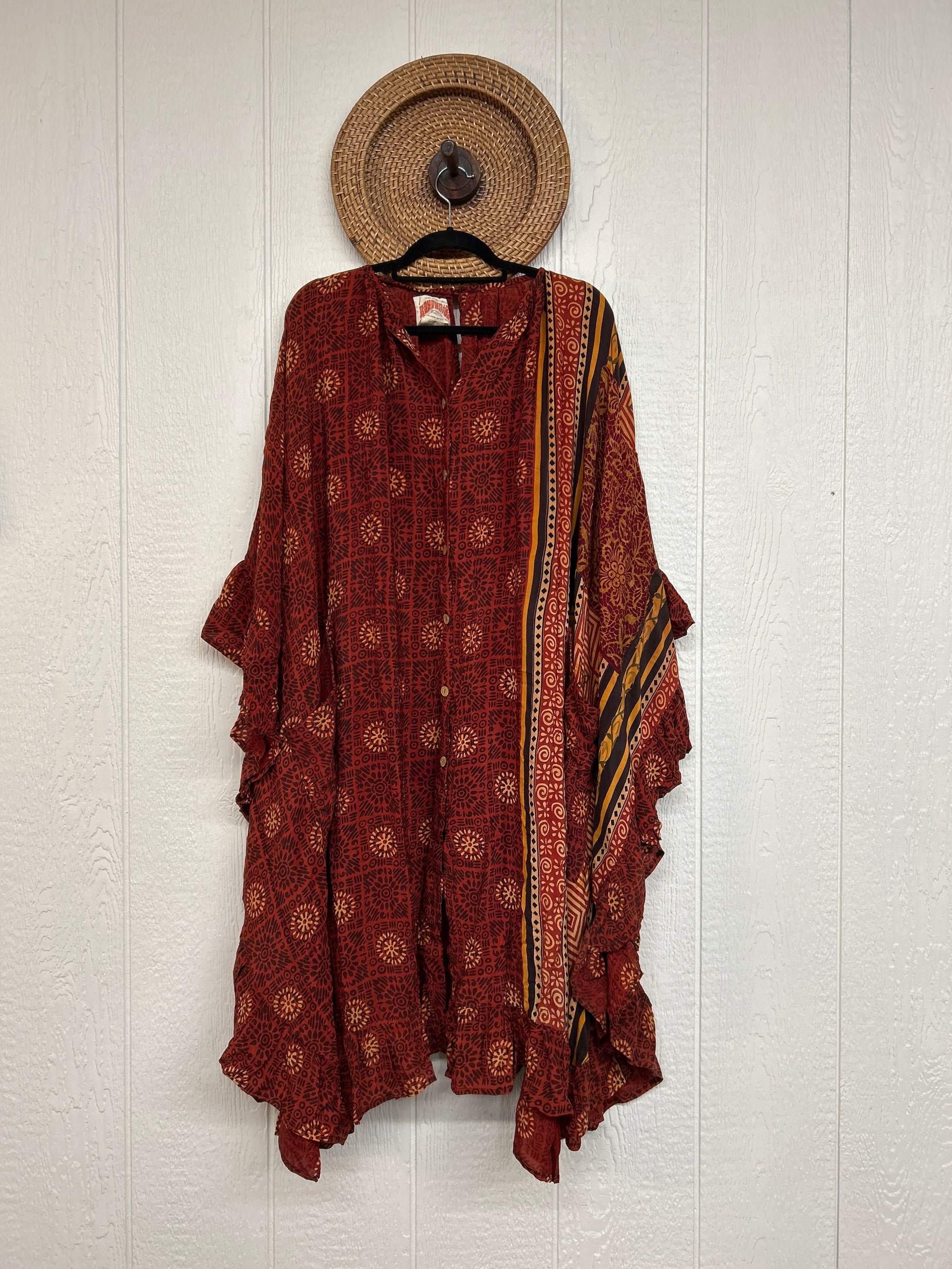 This dreamy muu is crafted from our ultra lux vintage crepe sari and features a button down placket and slouchy exterior pockets. Ruffles around the hem make this the ultimate rockstar layer that you can wear closed as a muu or open as a kimono!!