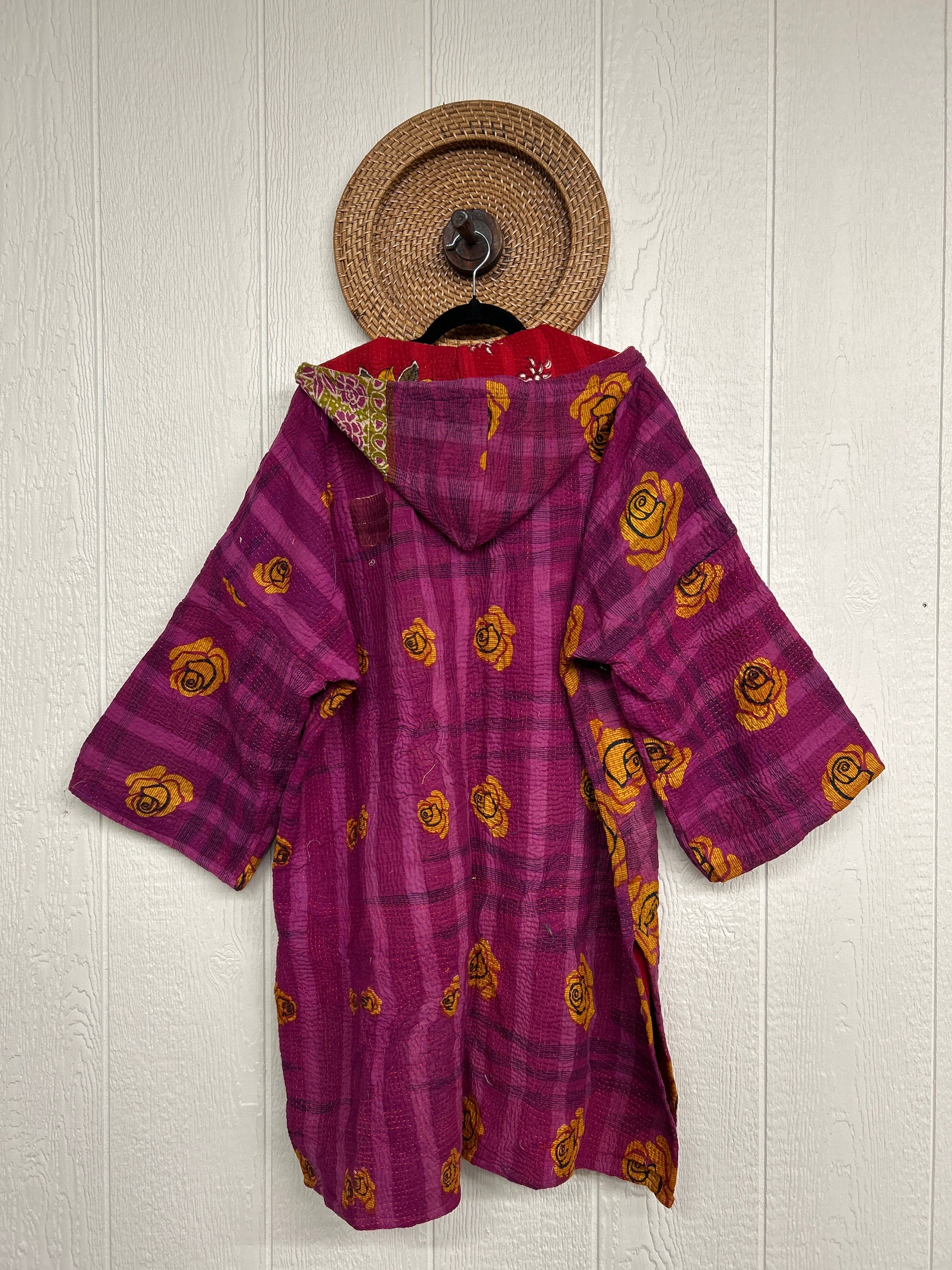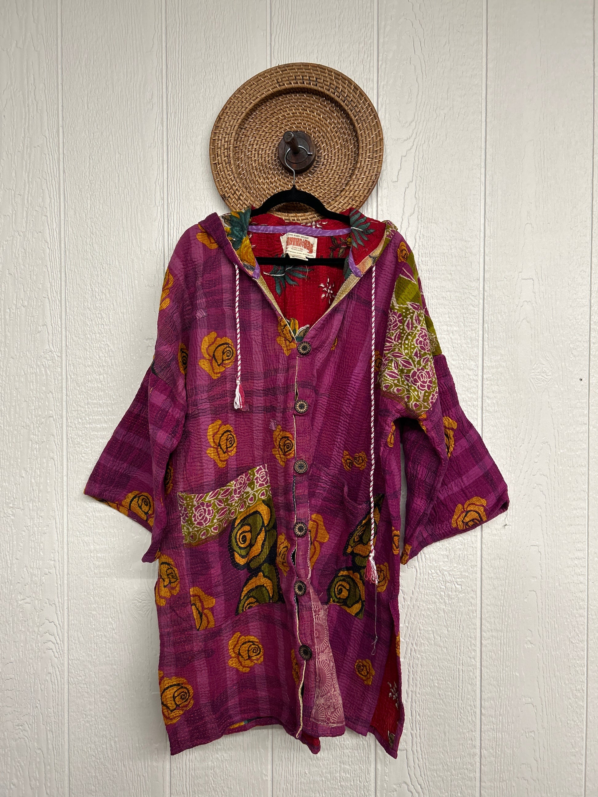 Cozy up in our Half Moon Shacket! Crafted from our ultra lux fine kantha stitched vintage cotton sari, the Half Moon Shacket features a hood, Button-down placket, deep front pockets and bell sleeves.