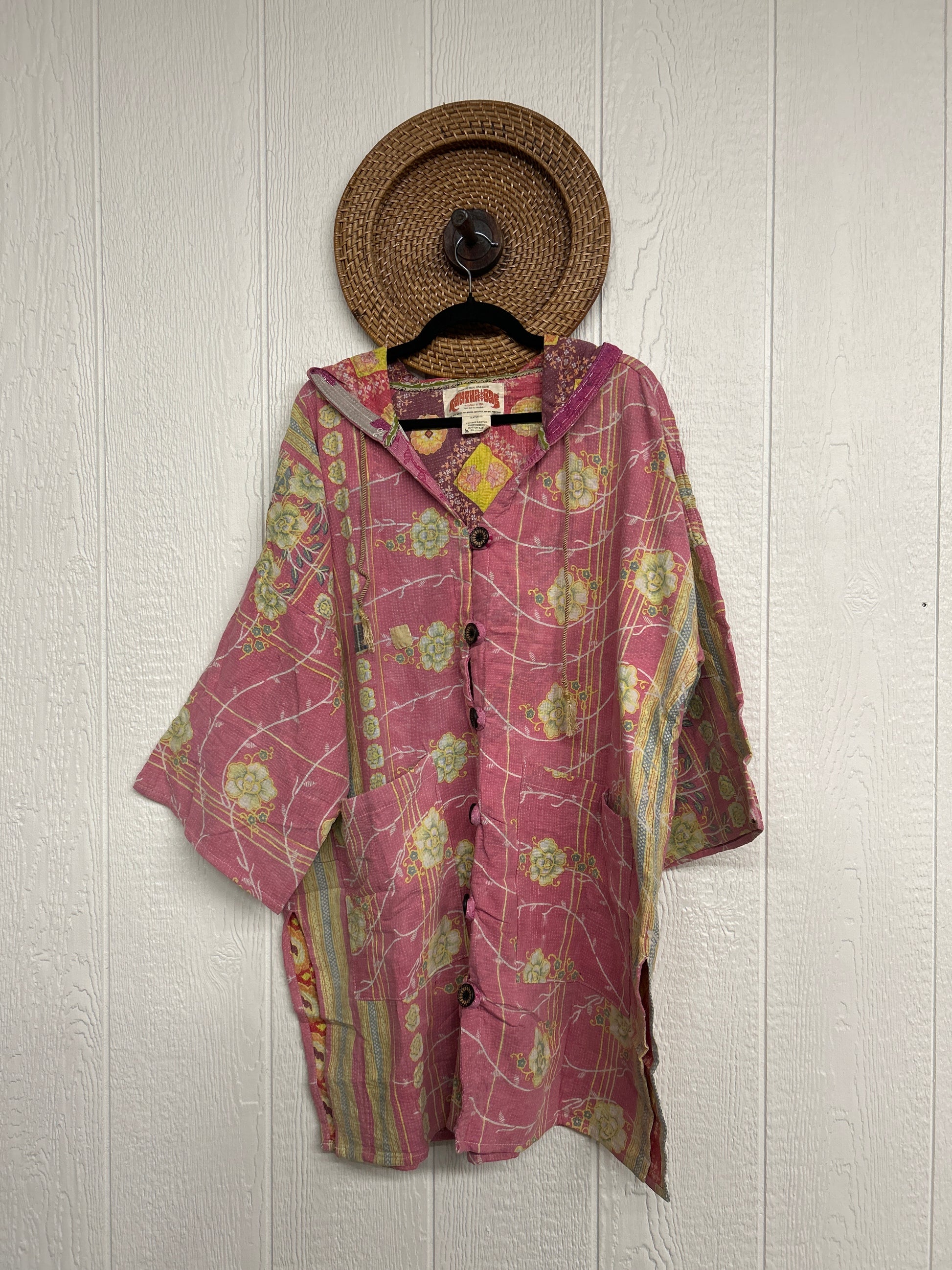 Cozy up in our Half Moon Shacket! Crafted from our ultra lux fine kantha stitched vintage cotton sari, the Half Moon Shacket features a hood, Button-down placket, deep front pockets and bell sleeves.