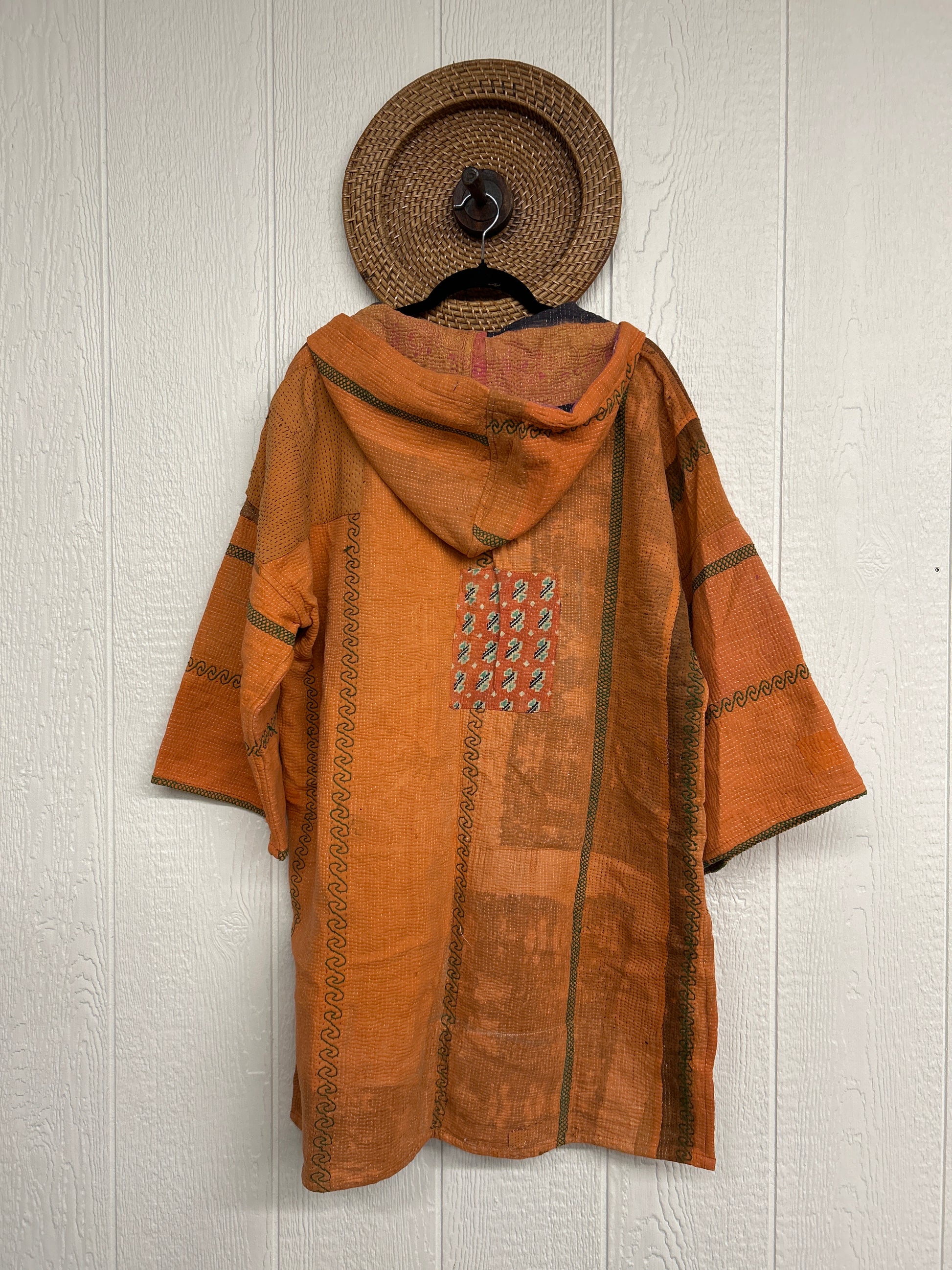 Cozy up in our Half Moon Shacket! Crafted from our ultra lux fine kantha stitched vintage cotton sari, the Half Moon Shacket features a hood, Button-down placket, deep front pockets and bell sleeves.
