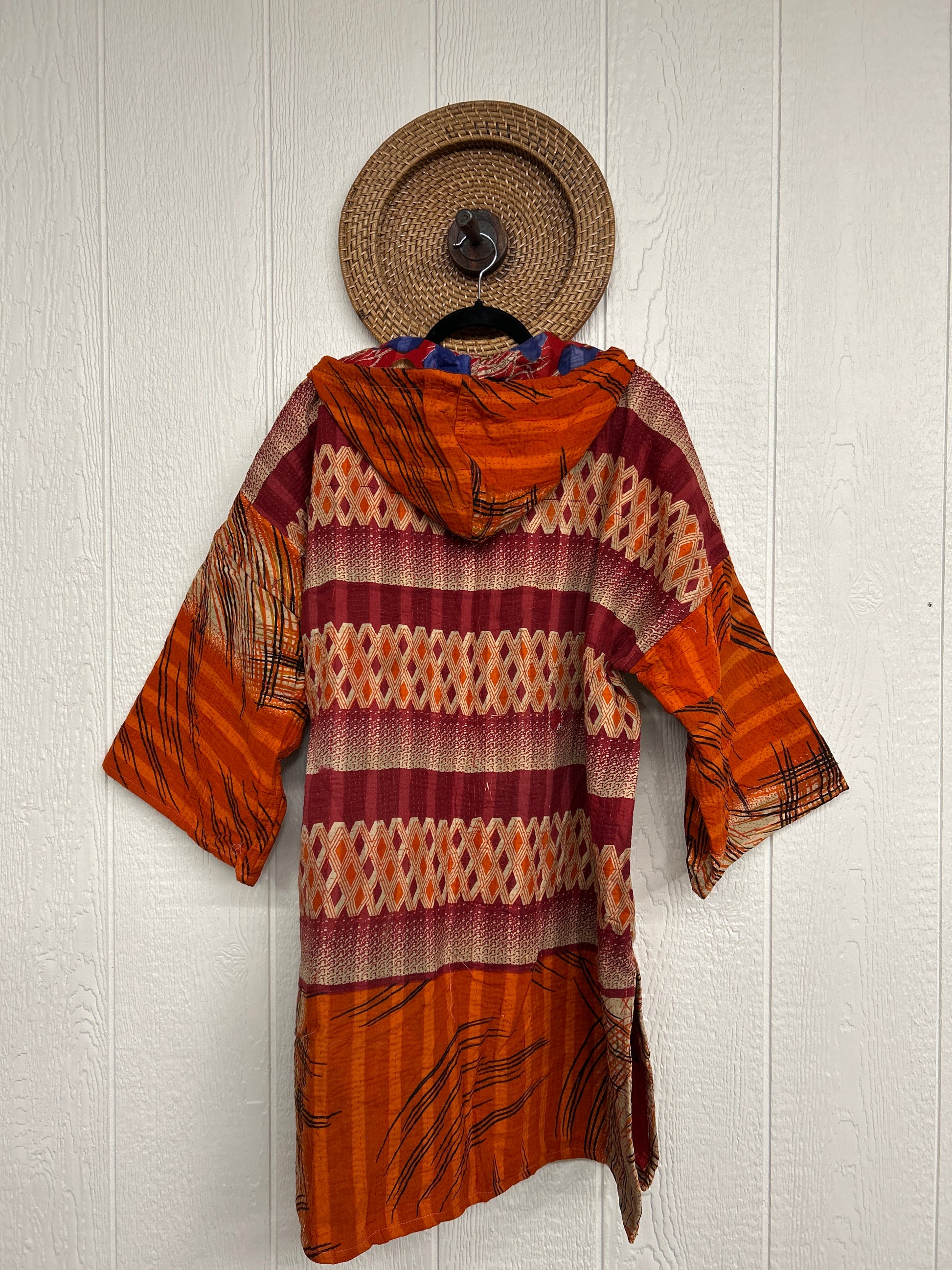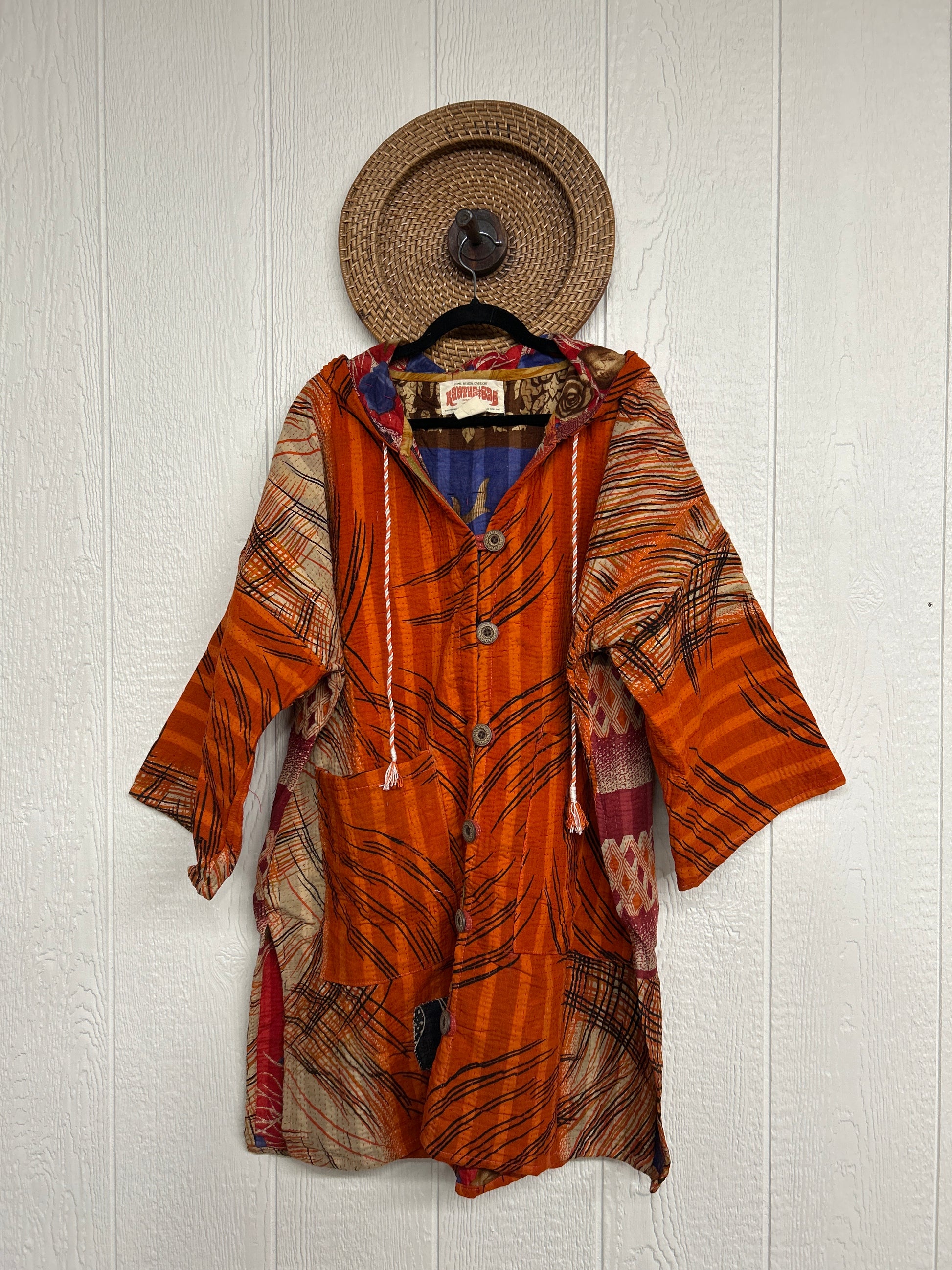 Cozy up in our Half Moon Shacket! Crafted from our ultra lux fine kantha stitched vintage cotton sari, the Half Moon Shacket features a hood, Button-down placket, deep front pockets and bell sleeves.