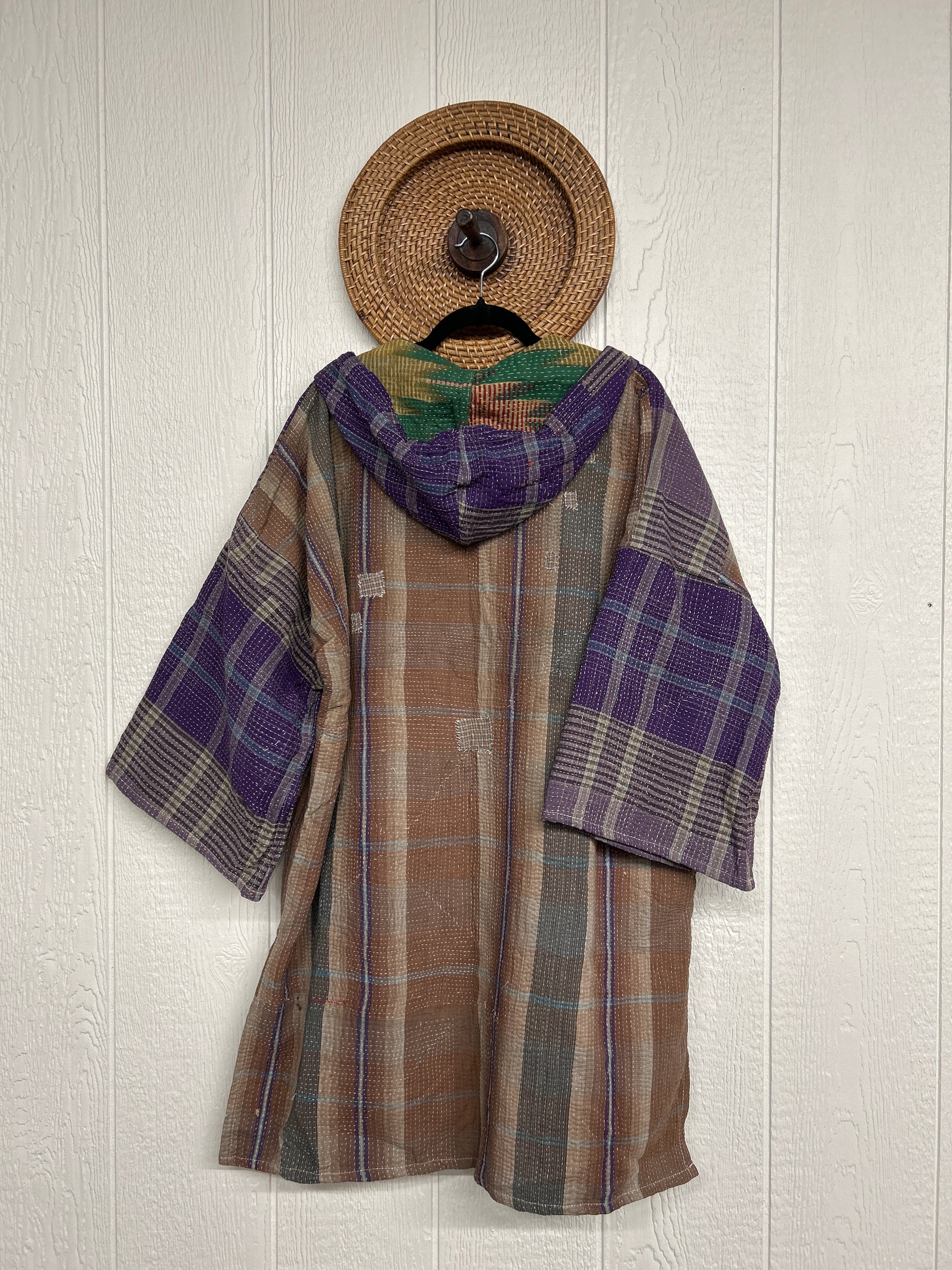 Cozy up in our Half Moon Shacket! Crafted from our ultra lux fine kantha stitched vintage cotton sari, the Half Moon Shacket features a hood, Button-down placket, deep front pockets and bell sleeves.
