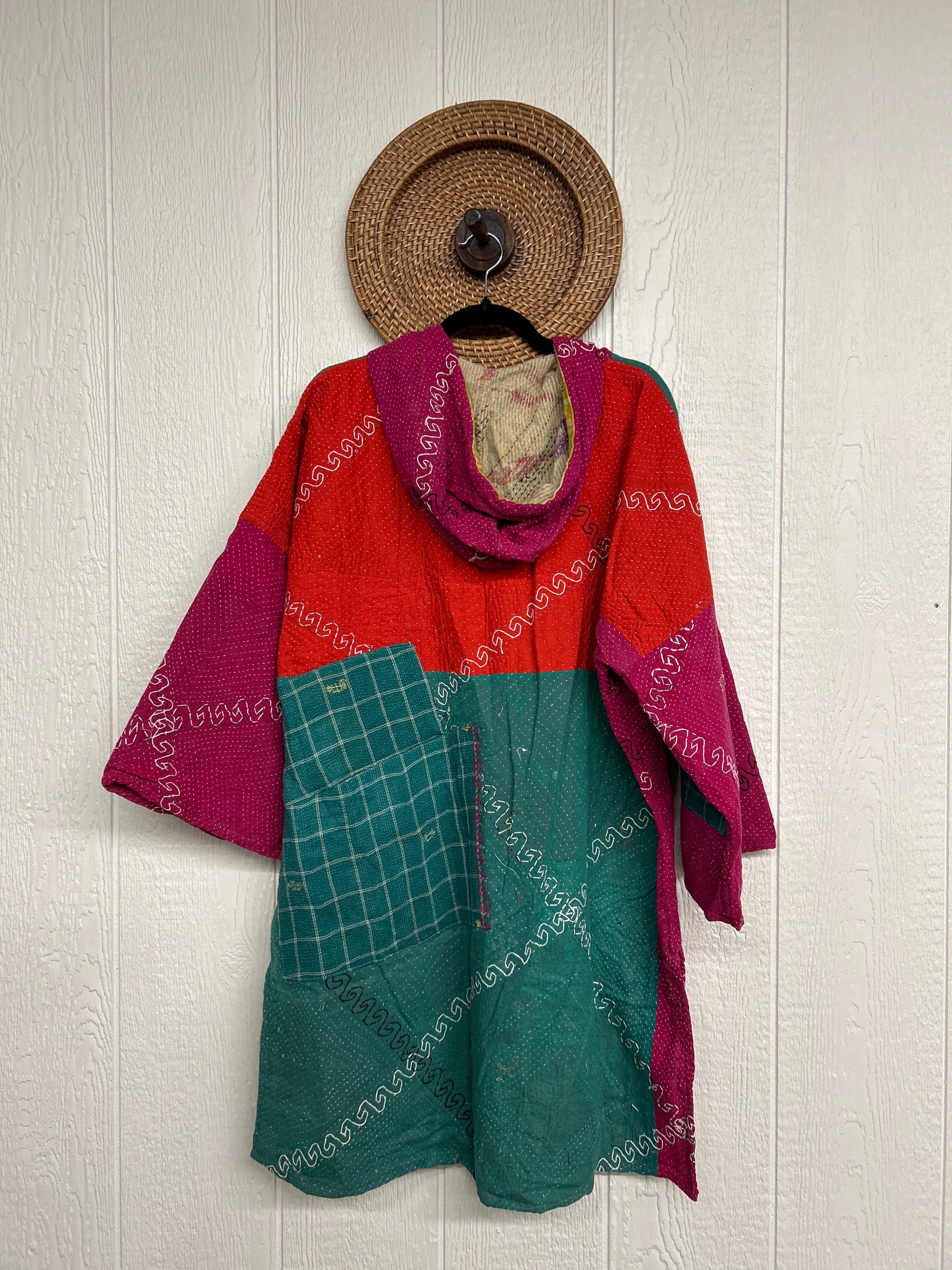 Cozy up in our Half Moon Shacket! Crafted from our ultra lux fine kantha stitched vintage cotton sari, the Half Moon Shacket features a hood, Button-down placket, deep front pockets and bell sleeves.