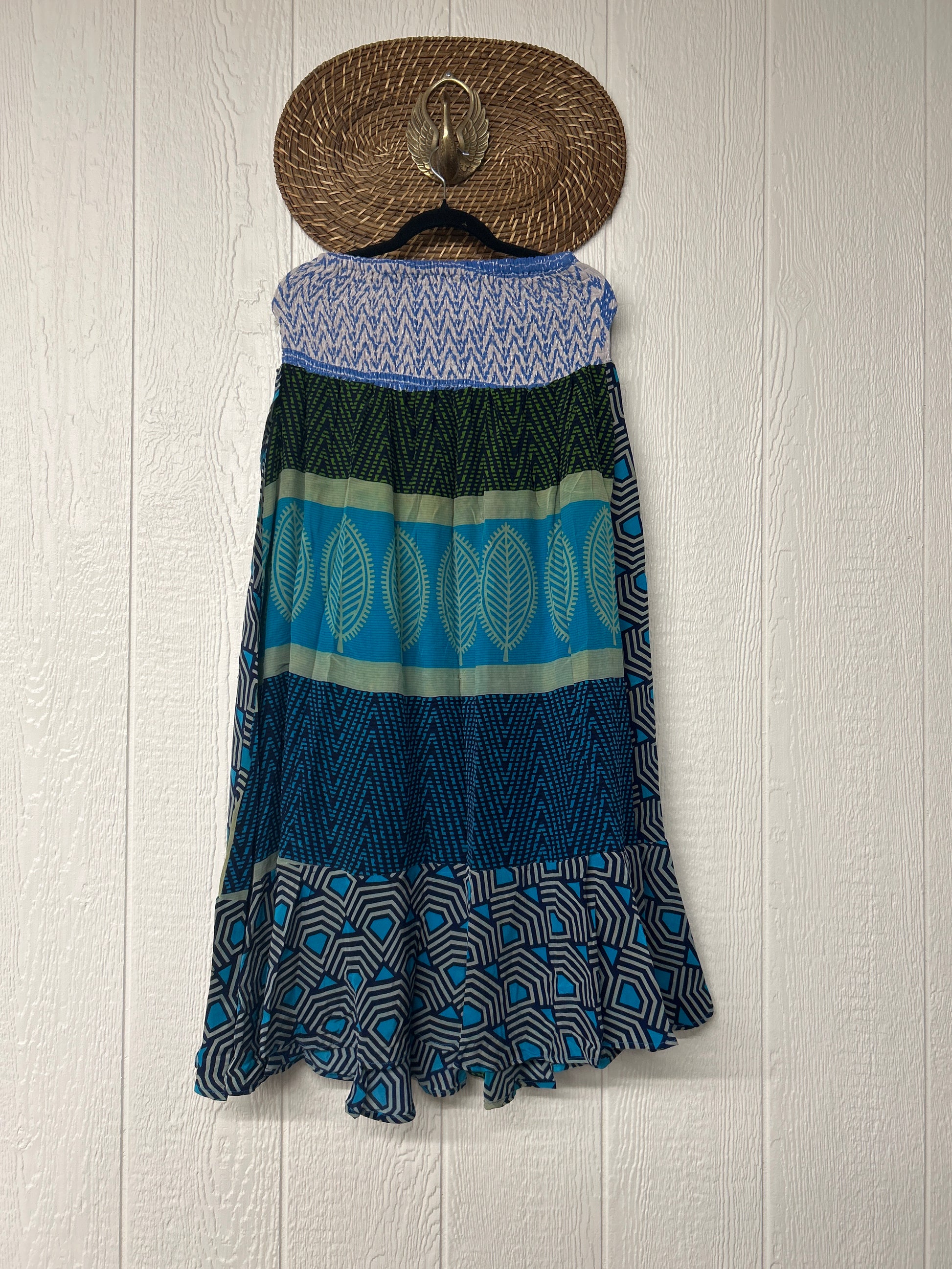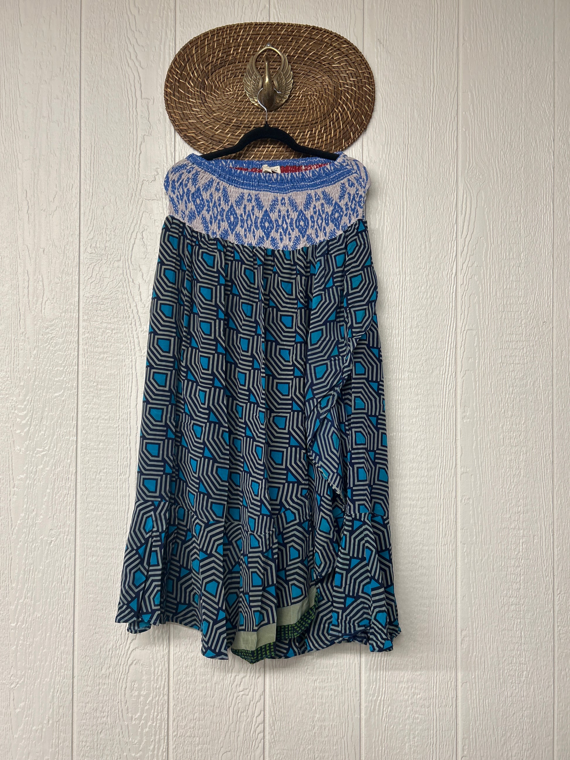 Crafted from vintage crepe sari this ethereal piece features a curved front wrap panel tacked on to the stretchy kantha waistband creating a flirty silhouette fit for a rockstar.