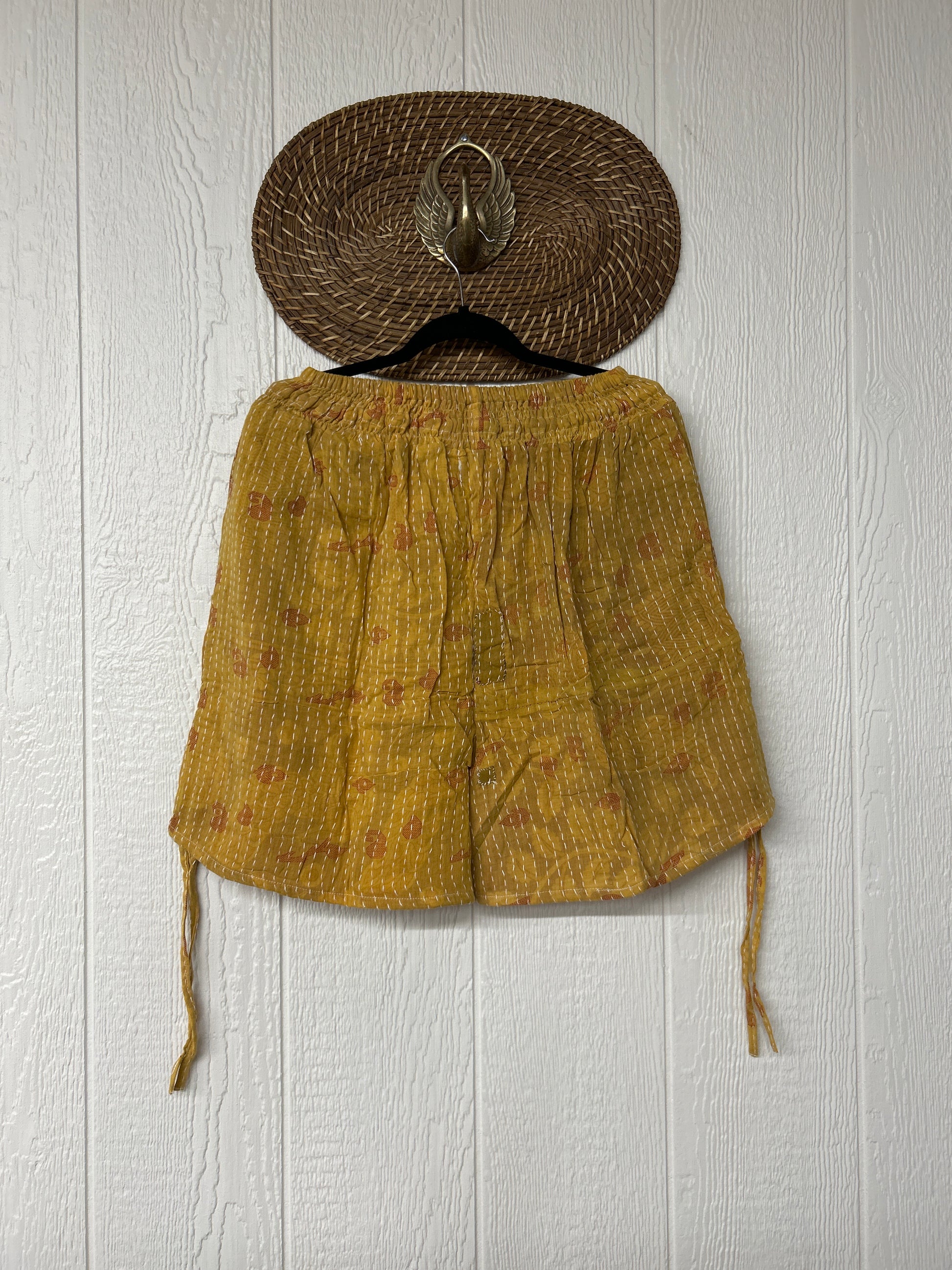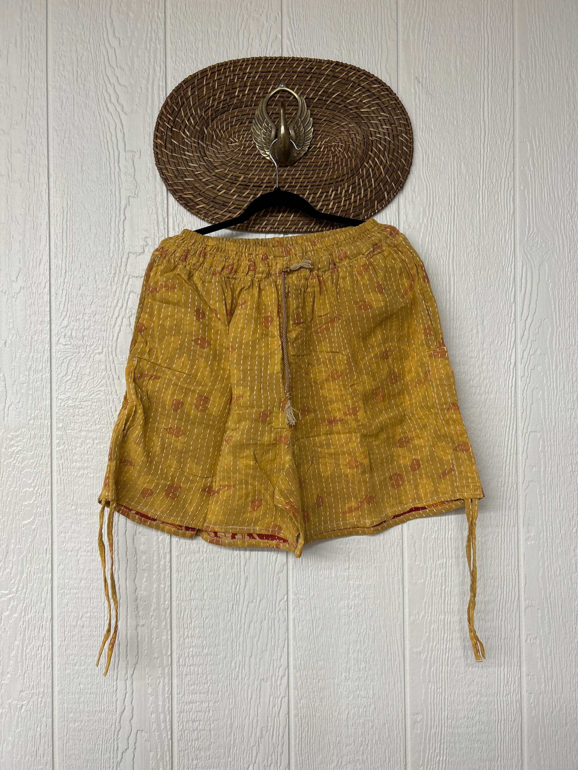Crafted from our ultra lux vintage cotton Kantha stitched sari. Features interior pockets, a smocked waistband that is soft against the skin with an adjustable drawstring. This fully customizable piece also has a cinch drawstring on the outer leg so you can make the shorts longer or shorter. We are obsessed!