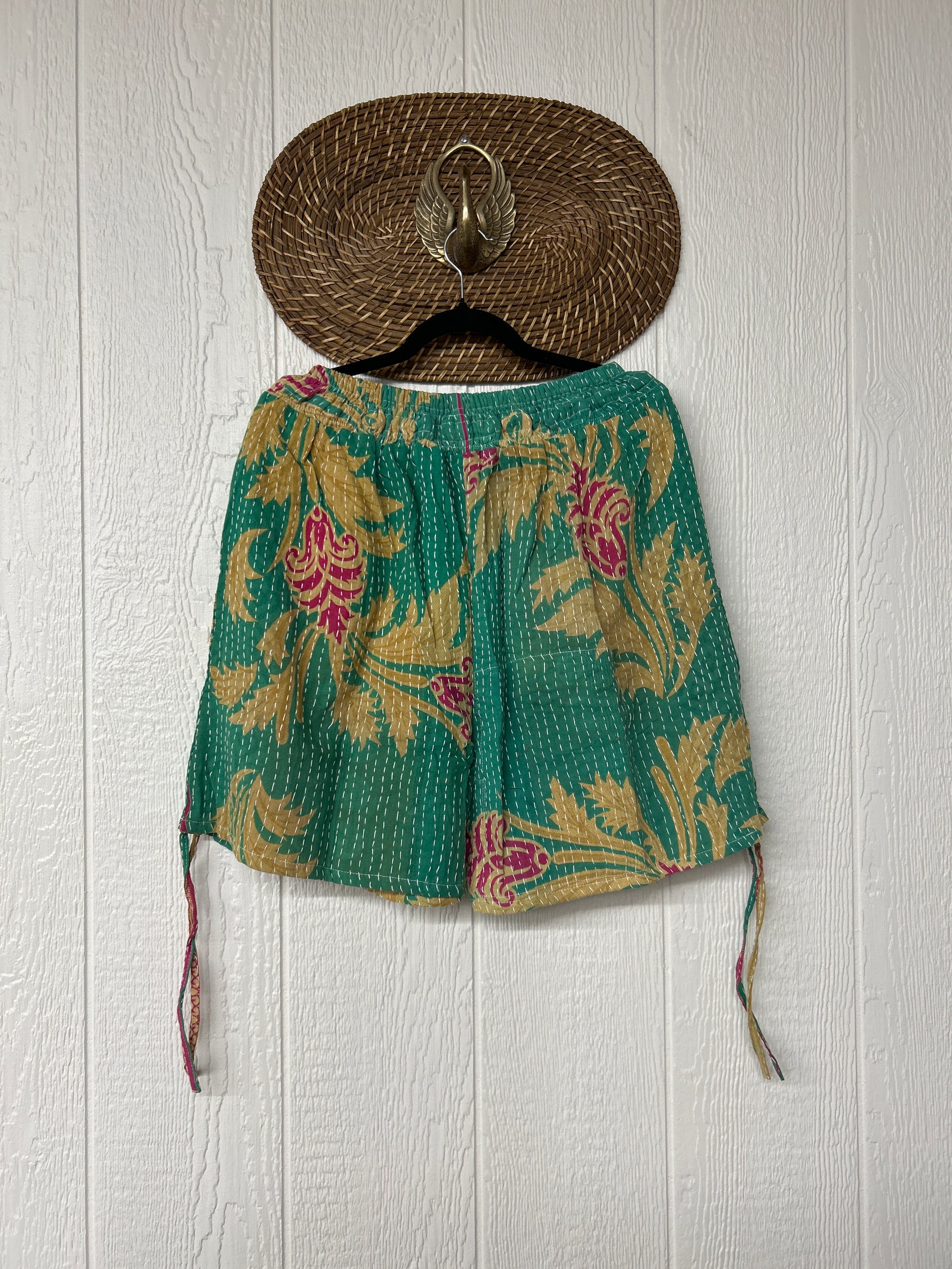 Crafted from our ultra lux vintage cotton Kantha stitched sari. Features interior pockets, a smocked waistband that is soft against the skin with an adjustable drawstring. This fully customizable piece also has a cinch drawstring on the outer leg so you can make the shorts longer or shorter. We are obsessed!