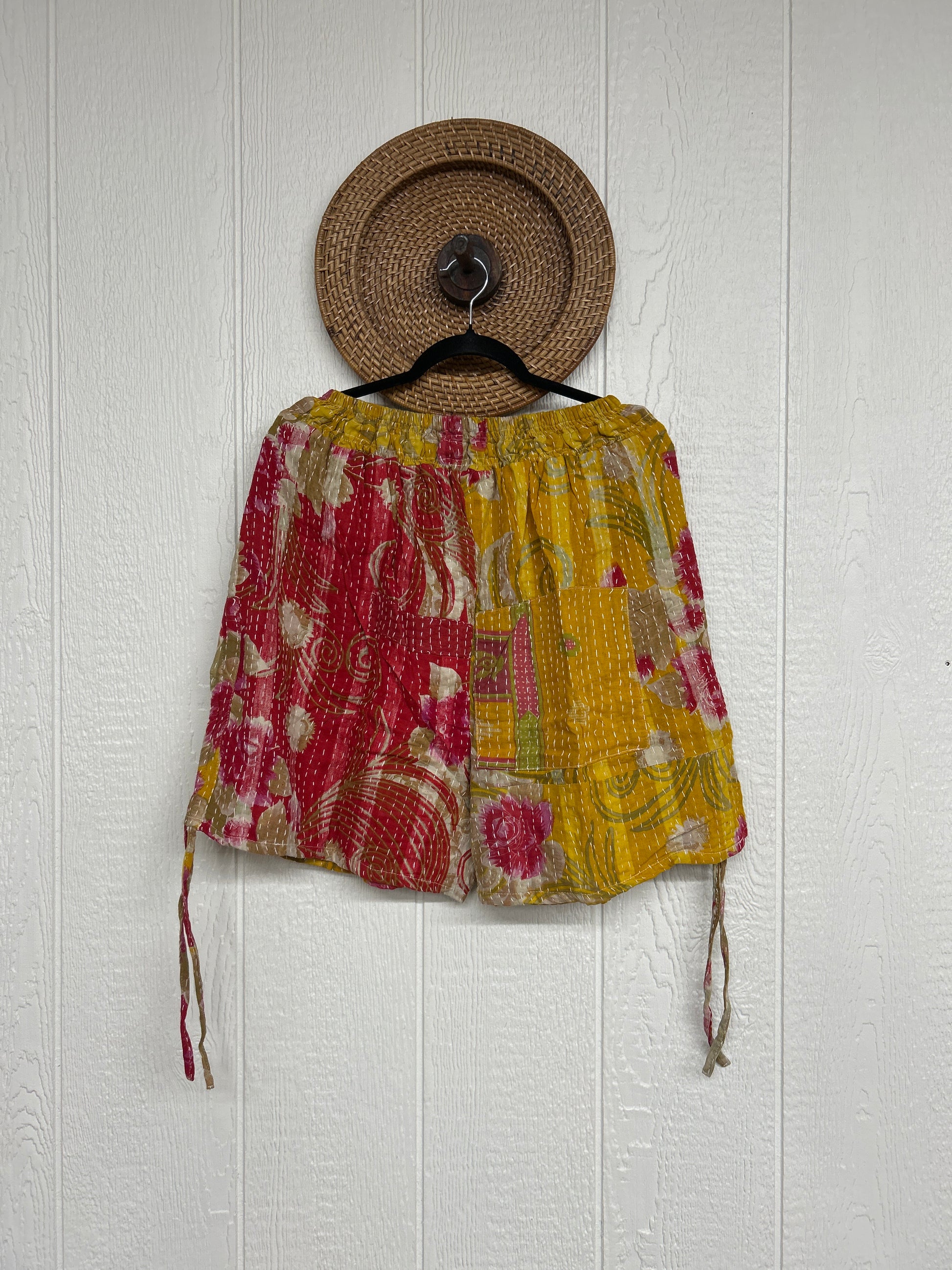 Crafted from our ultra lux vintage cotton Kantha stitched sari. Features interior pockets, a smocked waistband that is soft against the skin with an adjustable drawstring. This fully customizable piece also has a cinch drawstring on the outer leg so you can make the shorts longer or shorter. We are obsessed!