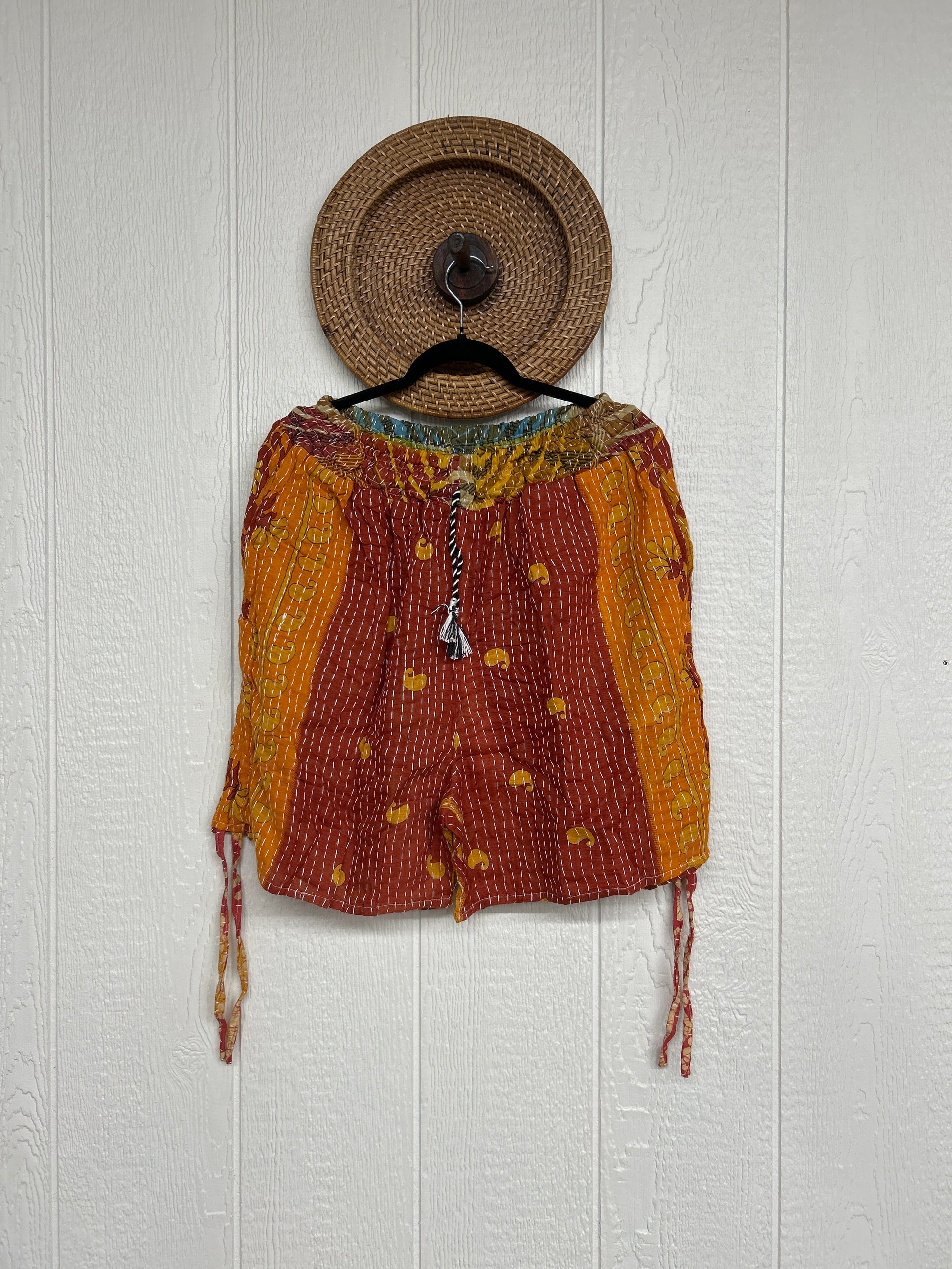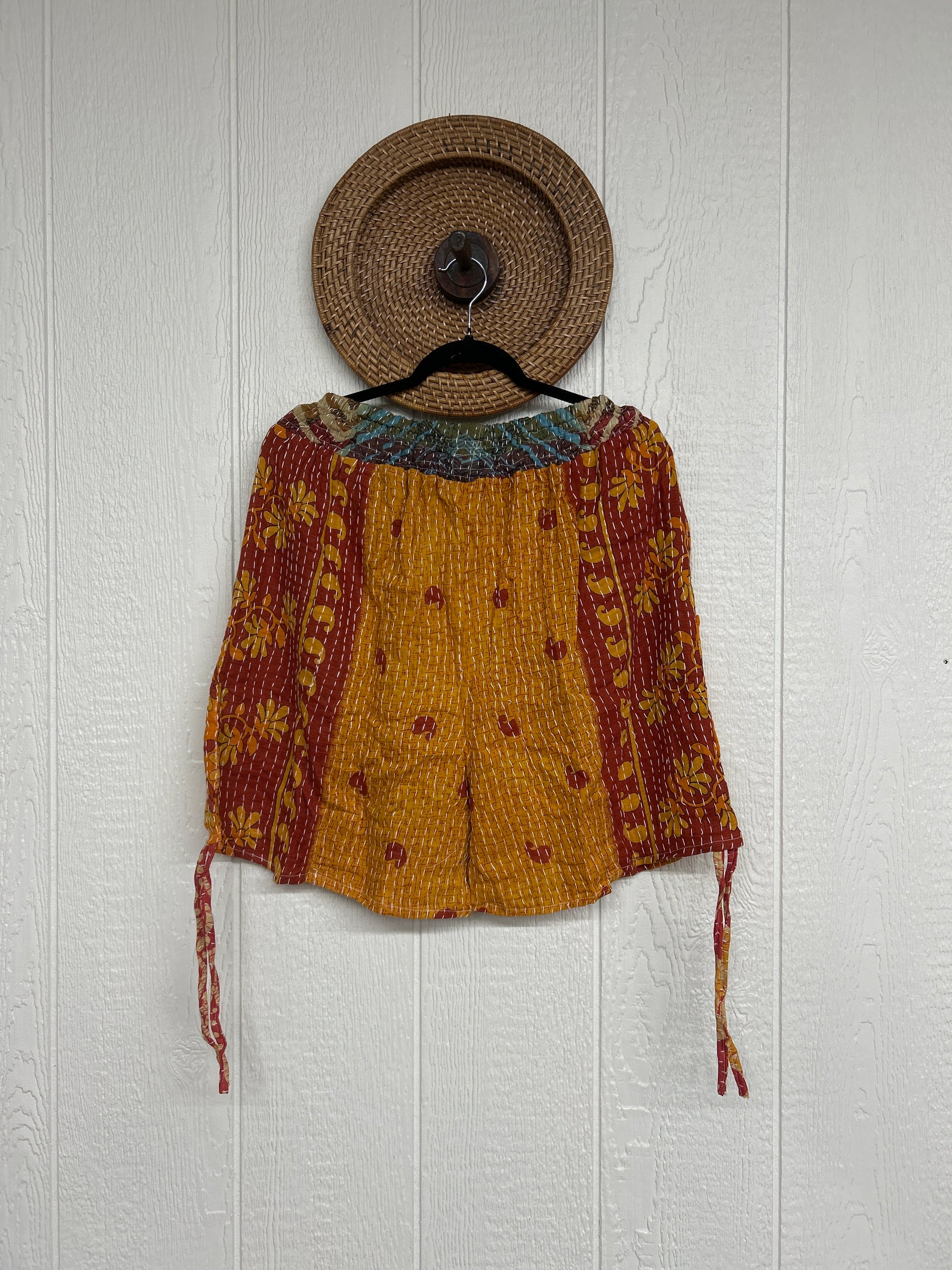 Crafted from our ultra lux vintage cotton Kantha stitched sari. Features interior pockets, a smocked waistband that is soft against the skin with an adjustable drawstring. This fully customizable piece also has a cinch drawstring on the outer leg so you can make the shorts longer or shorter. We are obsessed!