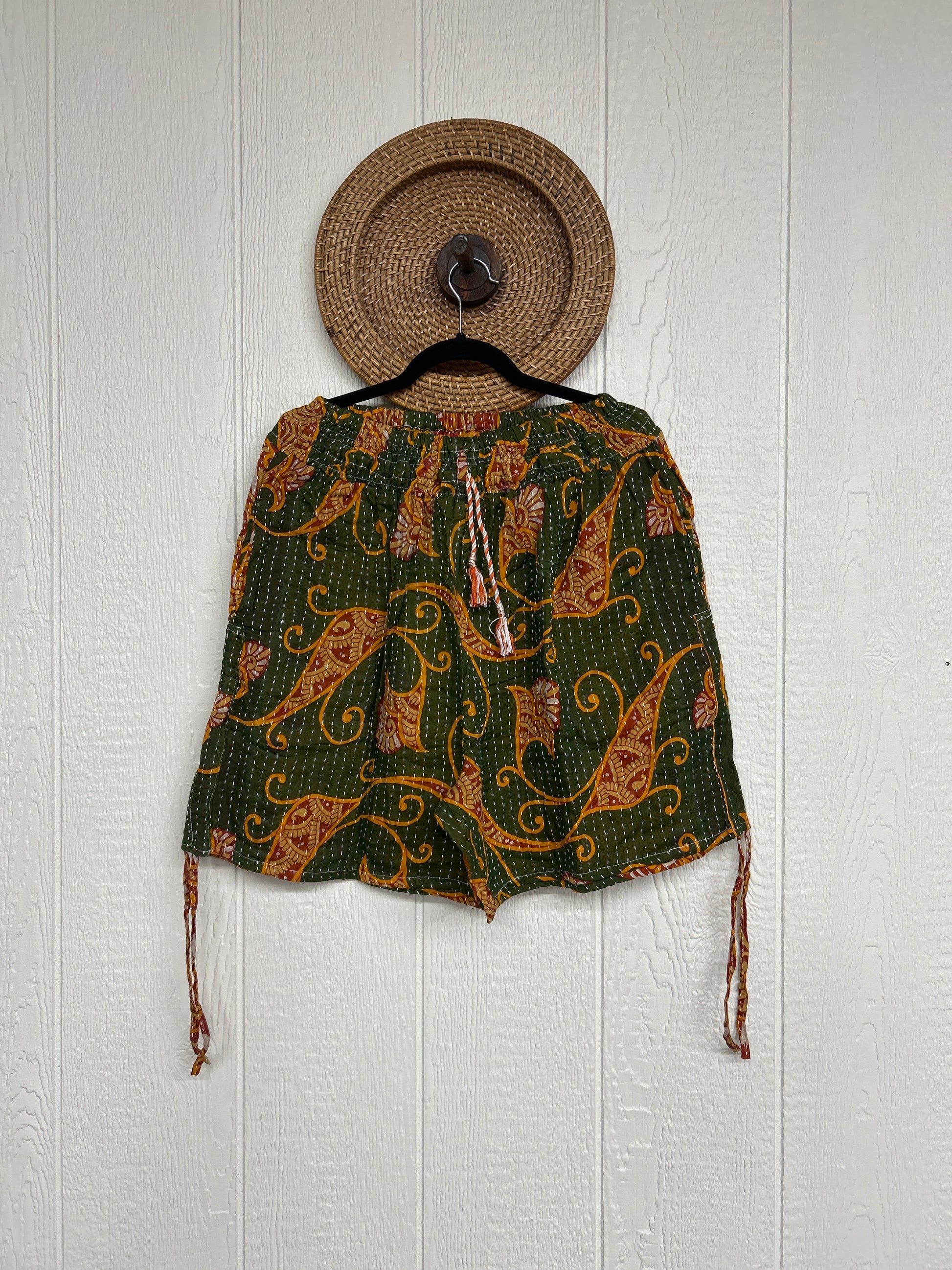 Crafted from our ultra lux vintage cotton Kantha stitched sari. Features interior pockets, a smocked waistband that is soft against the skin with an adjustable drawstring. This fully customizable piece also has a cinch drawstring on the outer leg so you can make the shorts longer or shorter. We are obsessed!