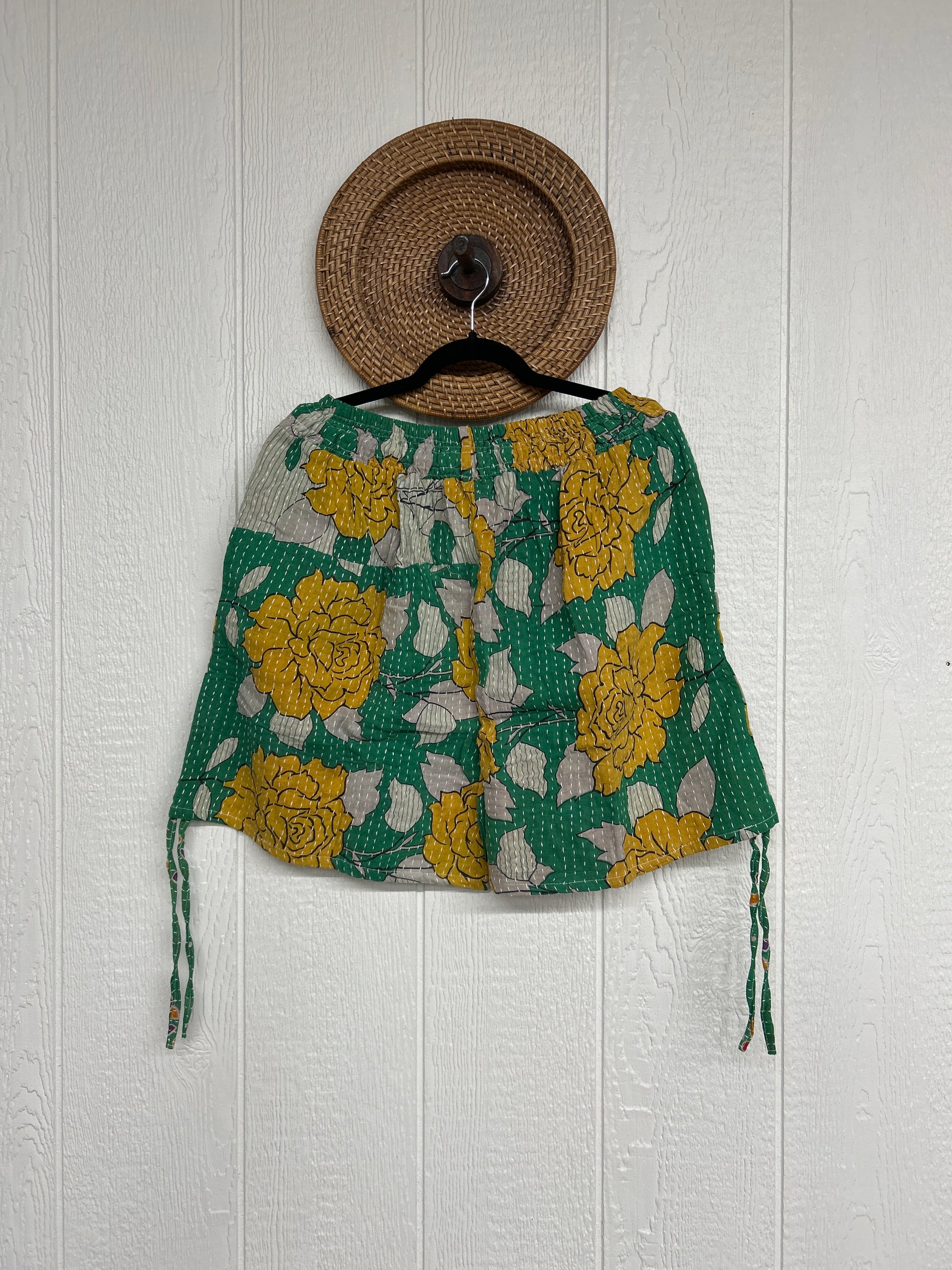 Crafted from our ultra lux vintage cotton Kantha stitched sari. Features interior pockets, a smocked waistband that is soft against the skin with an adjustable drawstring. This fully customizable piece also has a cinch drawstring on the outer leg so you can make the shorts longer or shorter. We are obsessed!