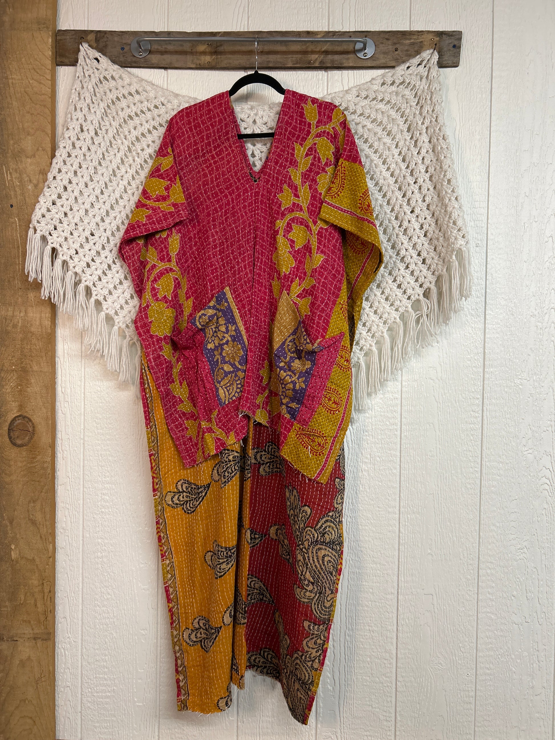The Kantha Hi/Lo Tunic is a reversible, free-size, throw-on-and-go fashion must have! It features a gorgeous deep V-neck and long trailing back. Styles beautifully with your favorite vintage shorts, leggings, or bells.