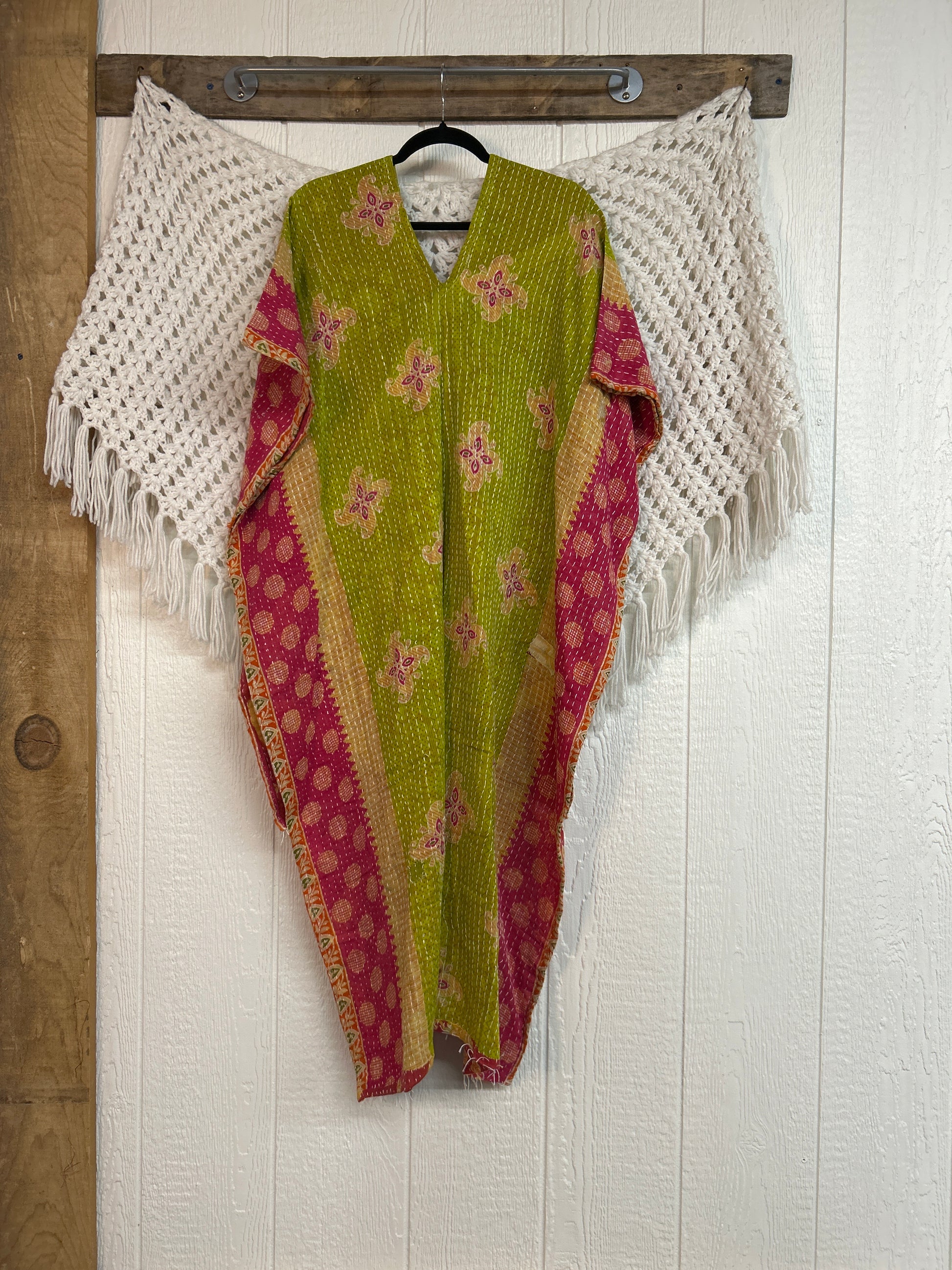 Disclosure: Our vintage styles have lived a full life before becoming the designs in our shop. Fabrics may have small threads or holes in the layers. Color inconsistency or small stains may be present. The saris are sewn together and extend the life of each design. Imperfections should be celebrated.