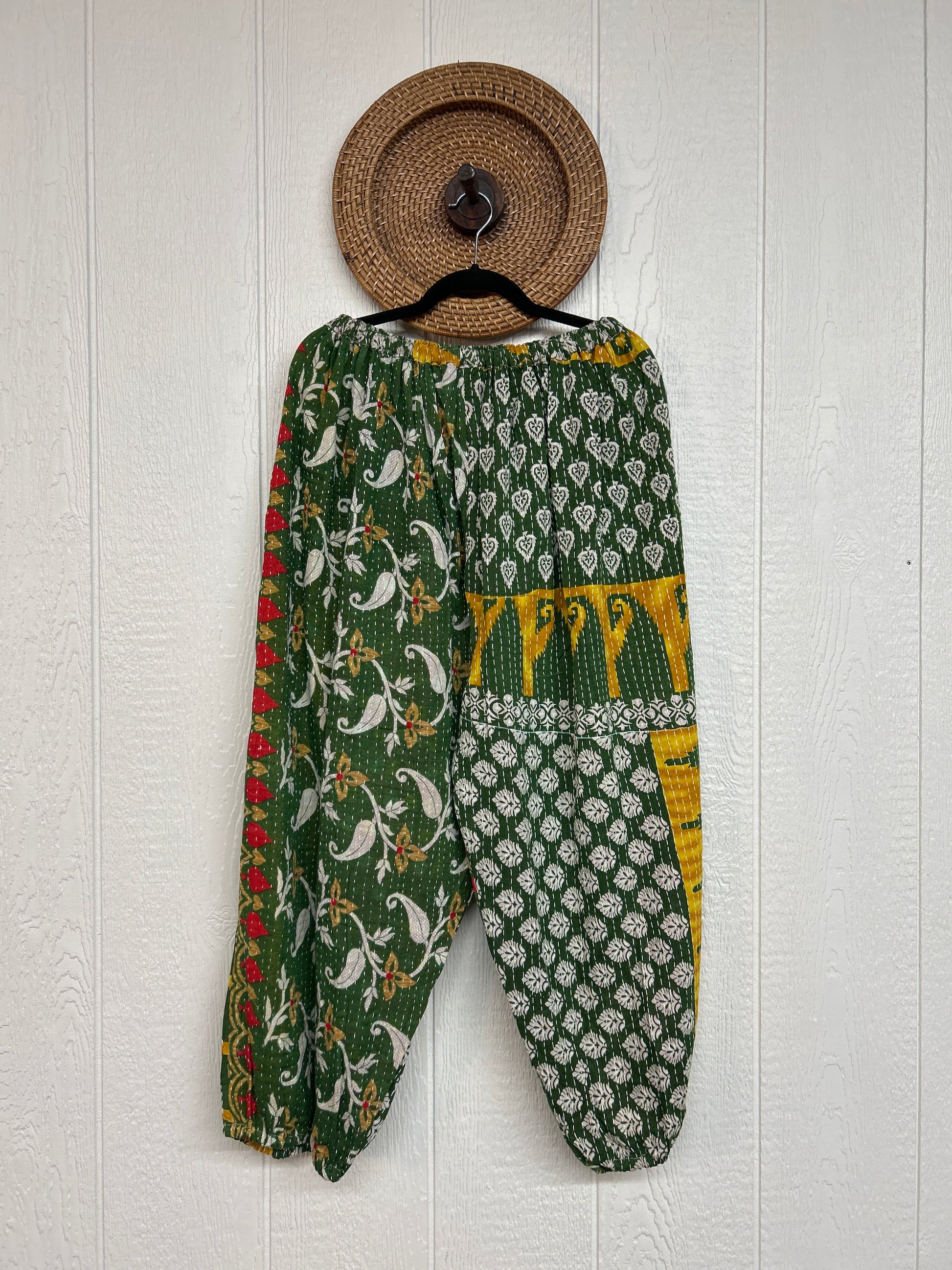 Crafted from luxe vintage kantha stitched cotton sari these chic kantha joggers feature two slouchy big exterior pockets and a thin elastic jogger opening at the leg . The waistband is magic and elastic featuring a drawstring for ultimate versatility.