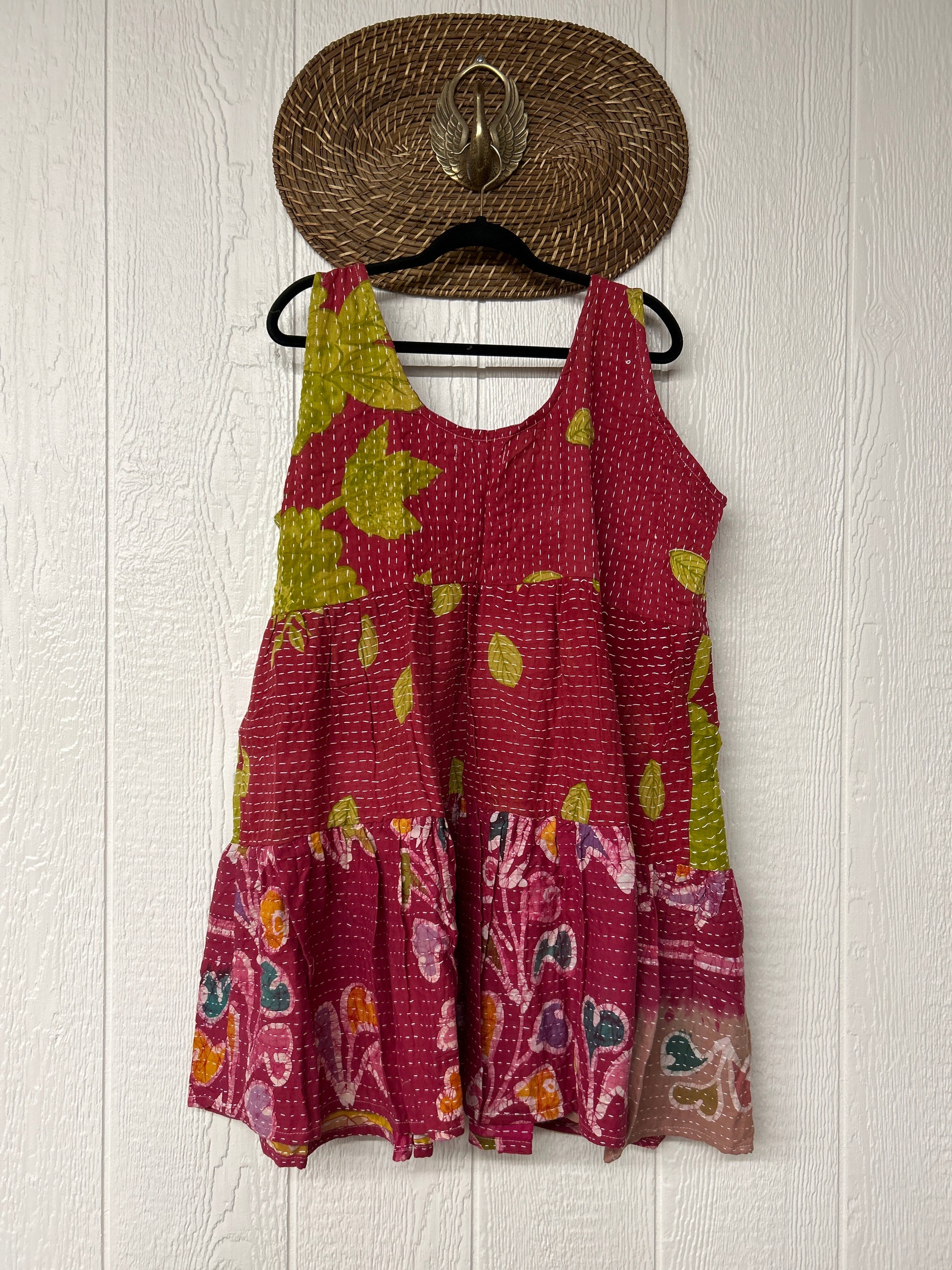 This sweet silhouette is crafted from our ultra lux Kantha stitched cotton sari. The Kantha Meadow Mini Dress features a button closure on the strap, deep interior front pockets, and a tiered bodice for extra twirling dimension!