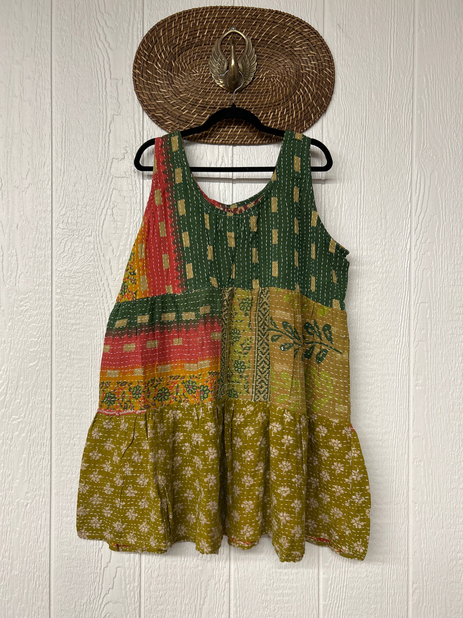 This sweet silhouette is crafted from our ultra lux Kantha stitched cotton sari. The Kantha Meadow Mini Dress features a button closure on the strap, deep interior front pockets, and a tiered bodice for extra twirling dimension!