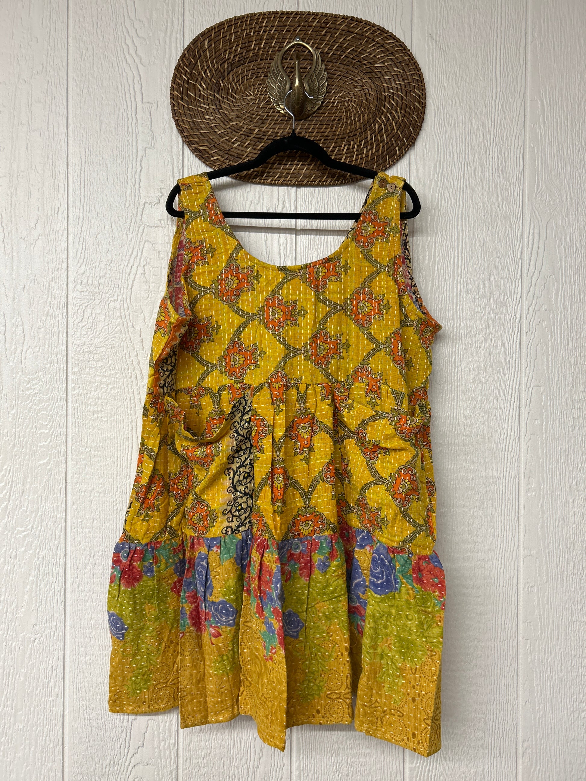 This sweet silhouette is crafted from our ultra lux Kantha stitched cotton sari. The Kantha Meadow Mini Dress features a button closure on the strap, deep interior front pockets, and a tiered bodice for extra twirling dimension!