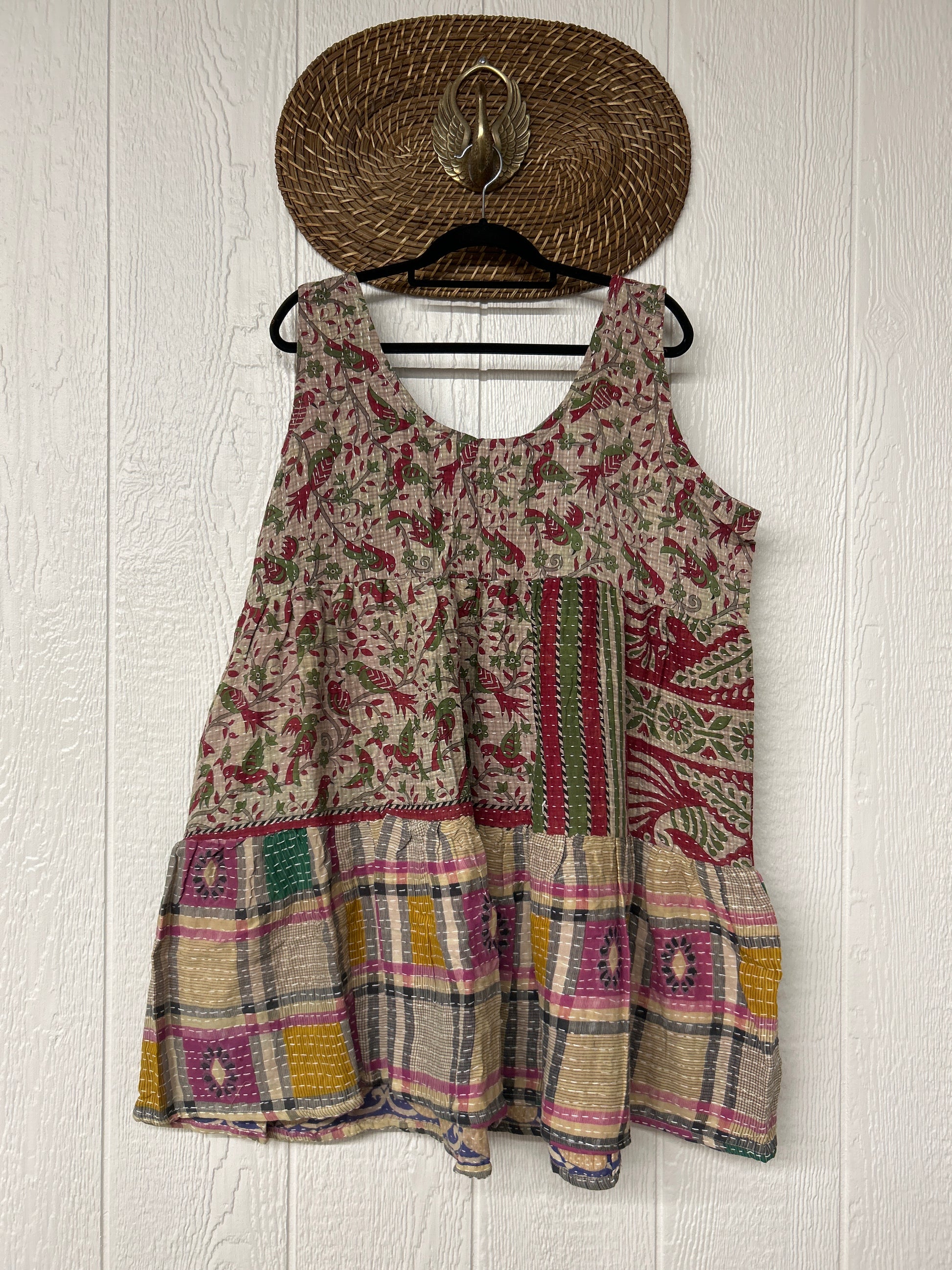 This sweet silhouette is crafted from our ultra lux Kantha stitched cotton sari. The Kantha Meadow Mini Dress features a button closure on the strap, deep interior front pockets, and a tiered bodice for extra twirling dimension!