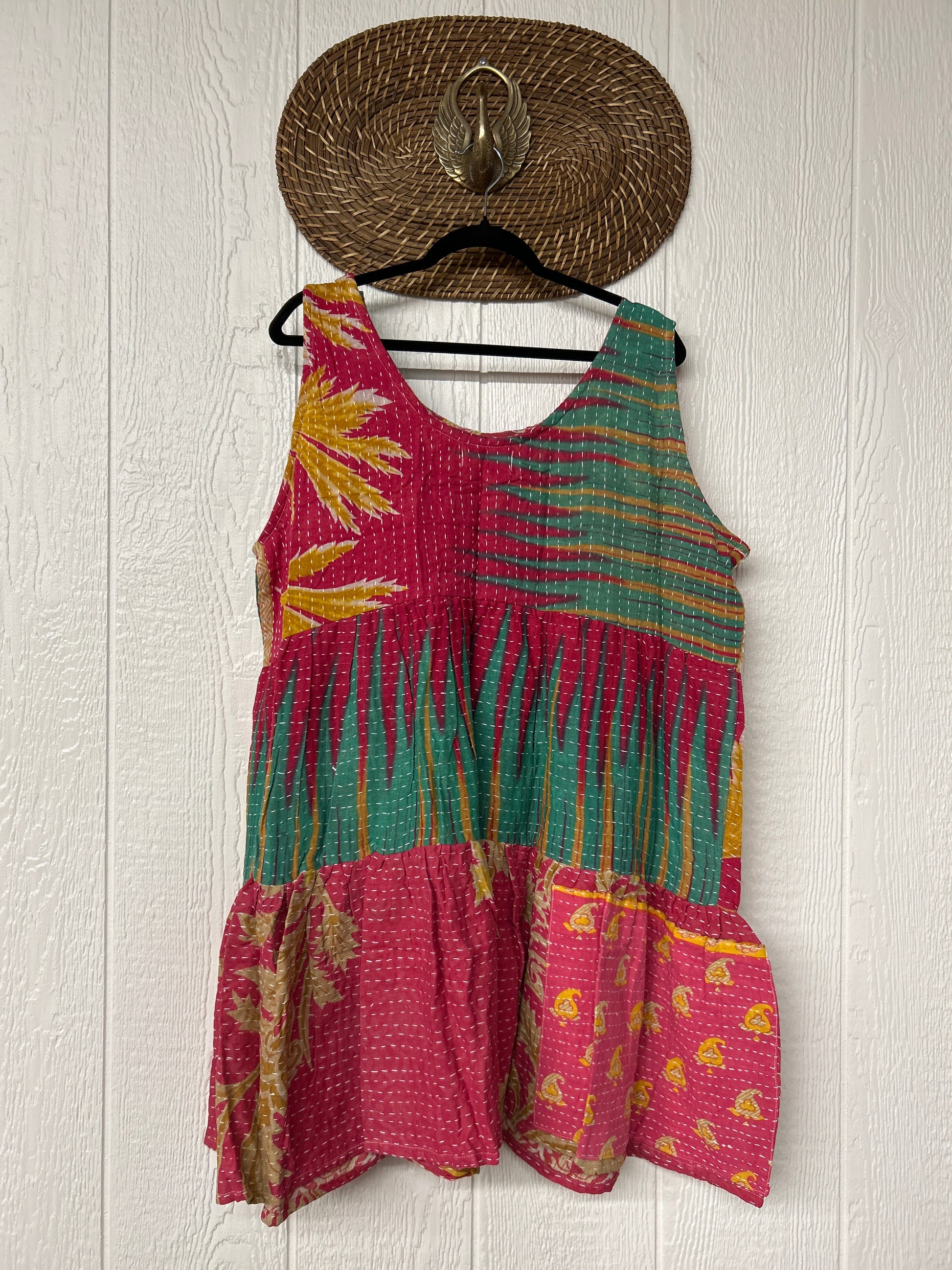This sweet silhouette is crafted from our ultra lux Kantha stitched cotton sari. The Kantha Meadow Mini Dress features a button closure on the strap, deep interior front pockets, and a tiered bodice for extra twirling dimension!