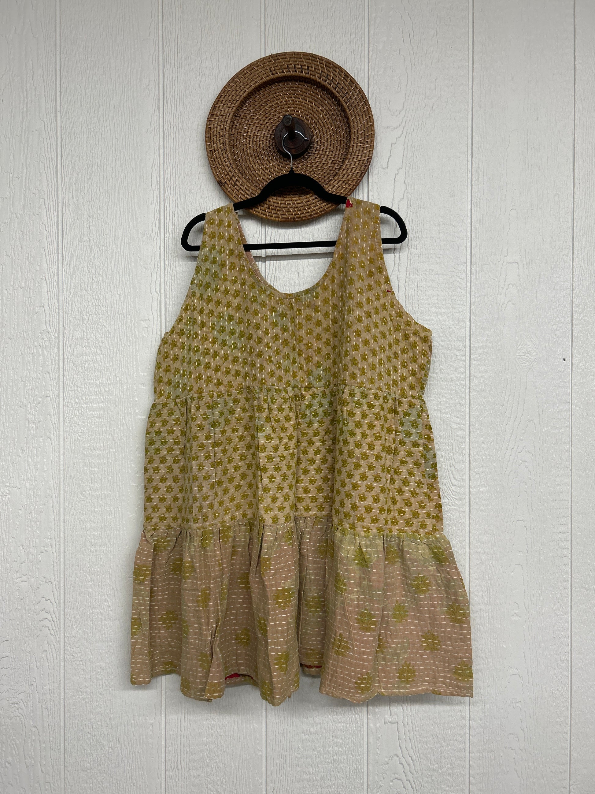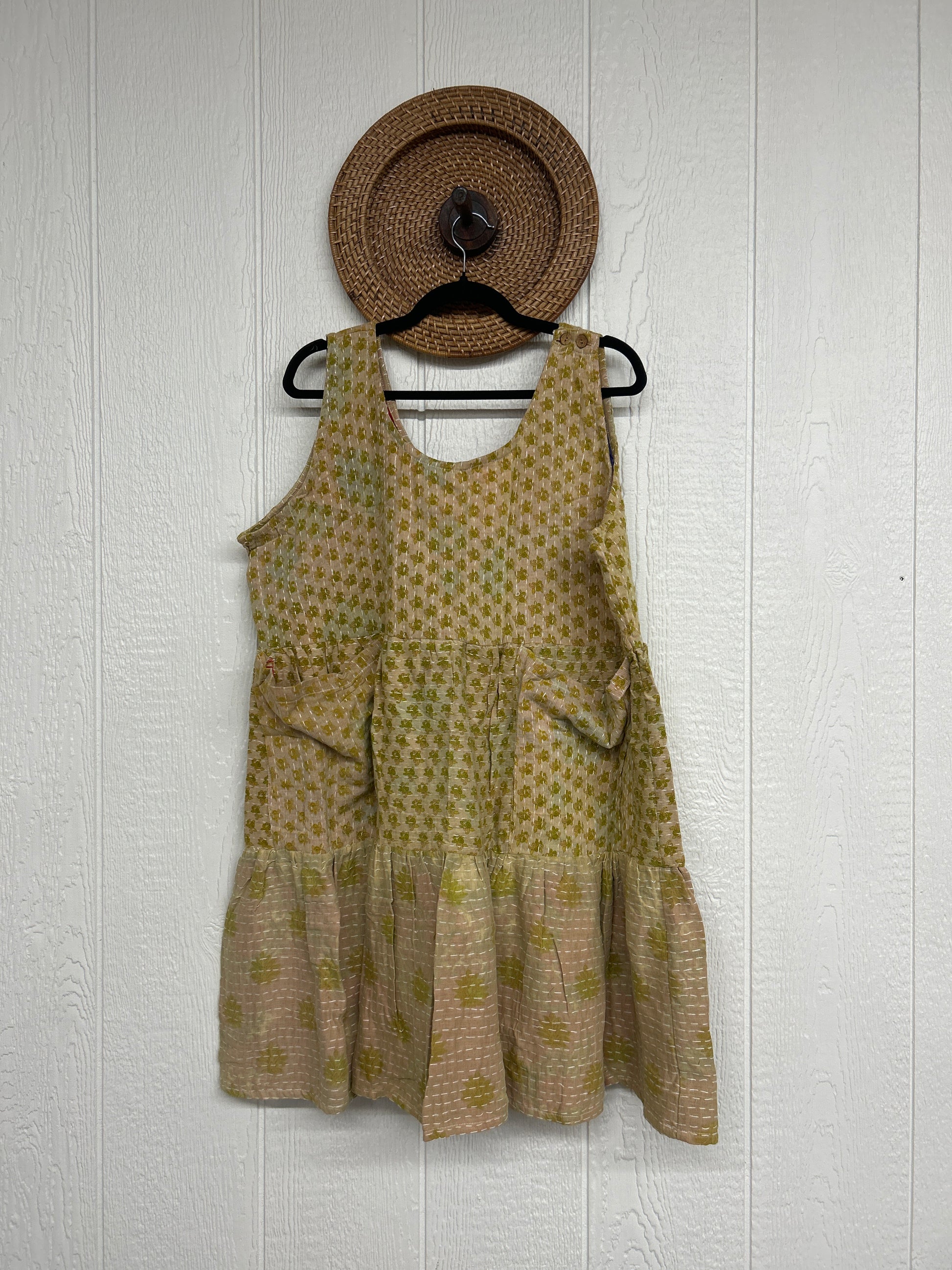 This sweet silhouette is crafted from our ultra lux Kantha stitched cotton sari. The Kantha Meadow Mini Dress features a button closure on the strap, deep interior front pockets, and a tiered bodice for extra twirling dimension!