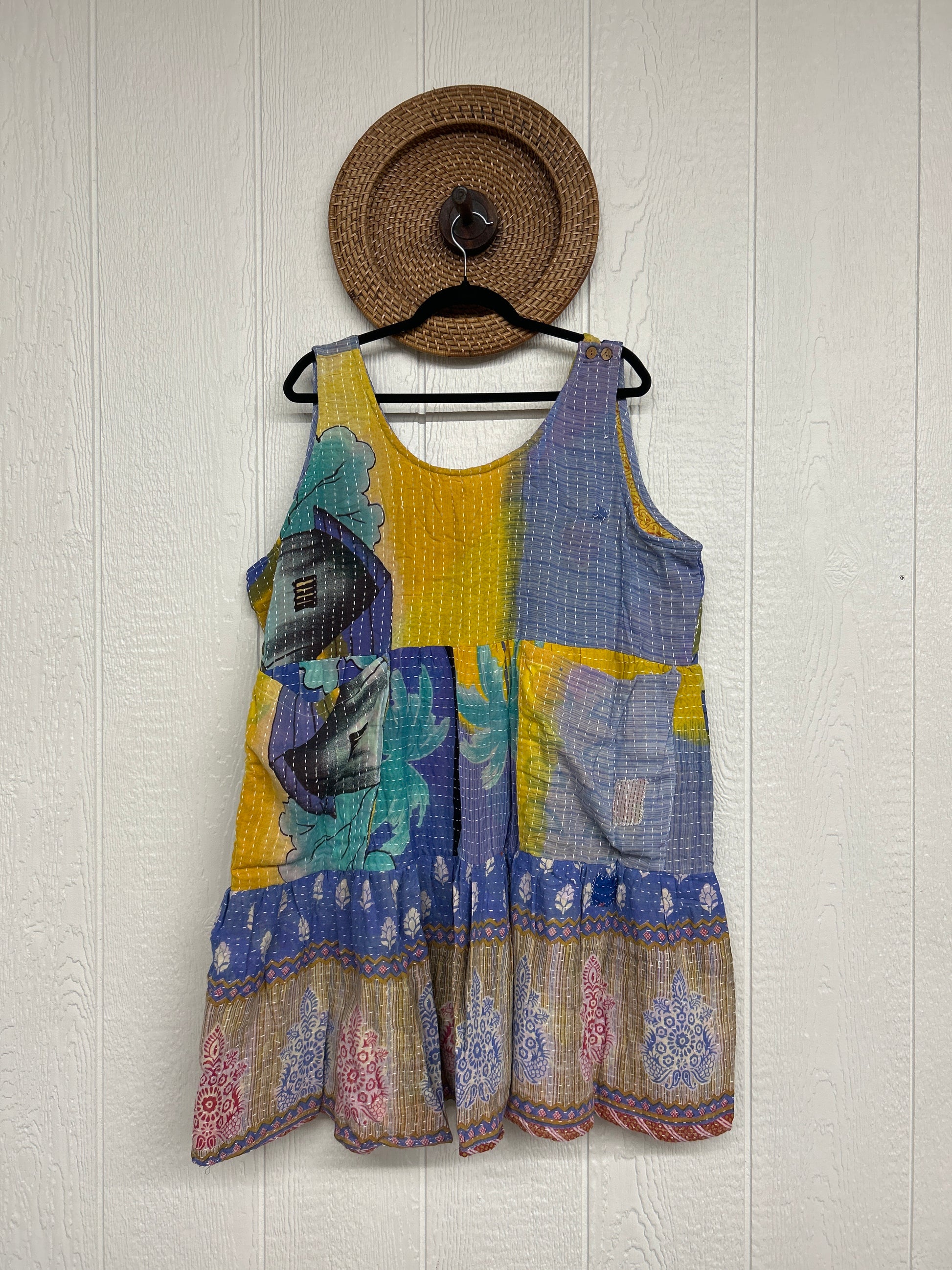 This sweet silhouette is crafted from our ultra lux Kantha stitched cotton sari. The Kantha Meadow Mini Dress features a button closure on the strap, deep interior front pockets, and a tiered bodice for extra twirling dimension!