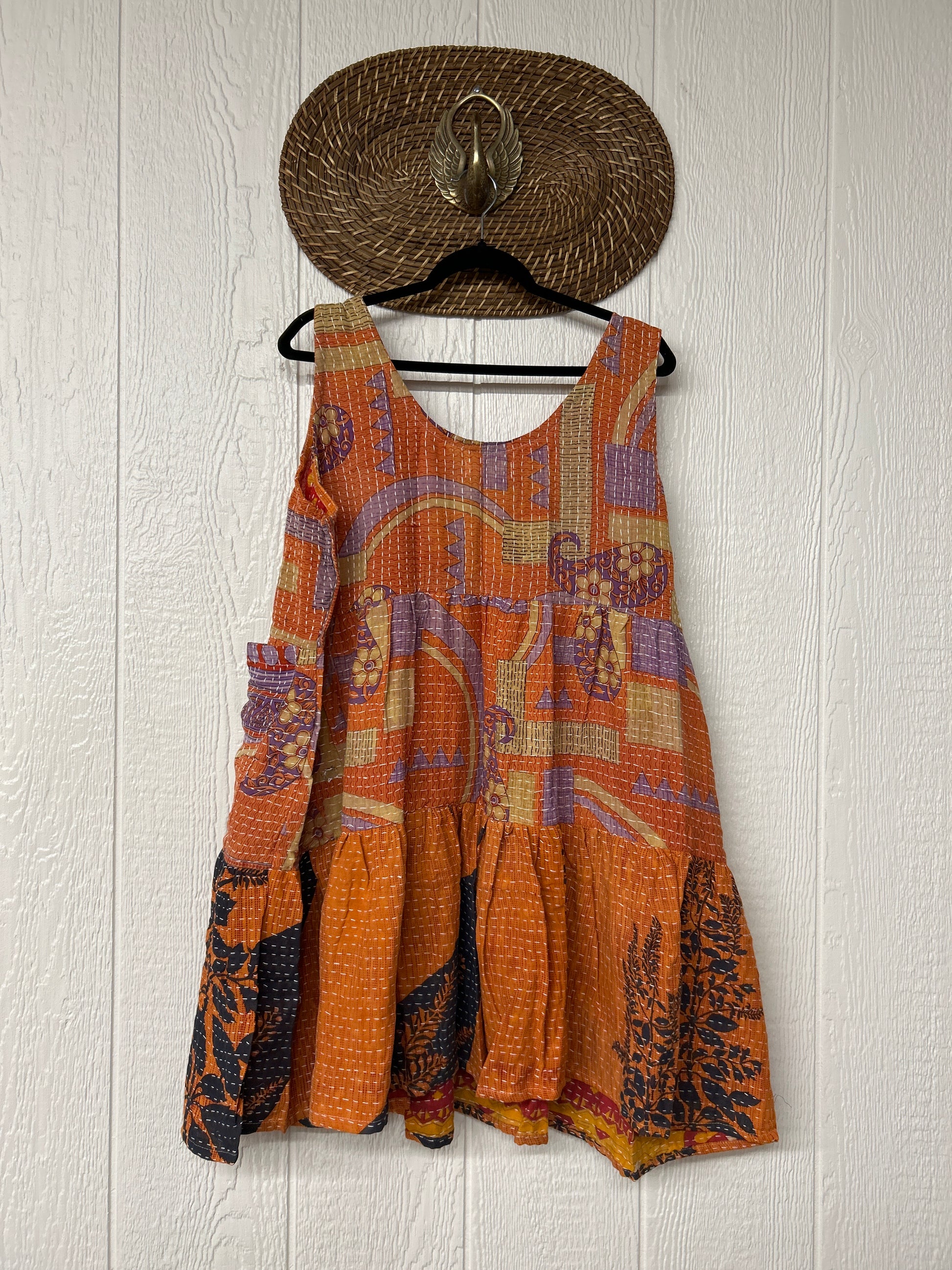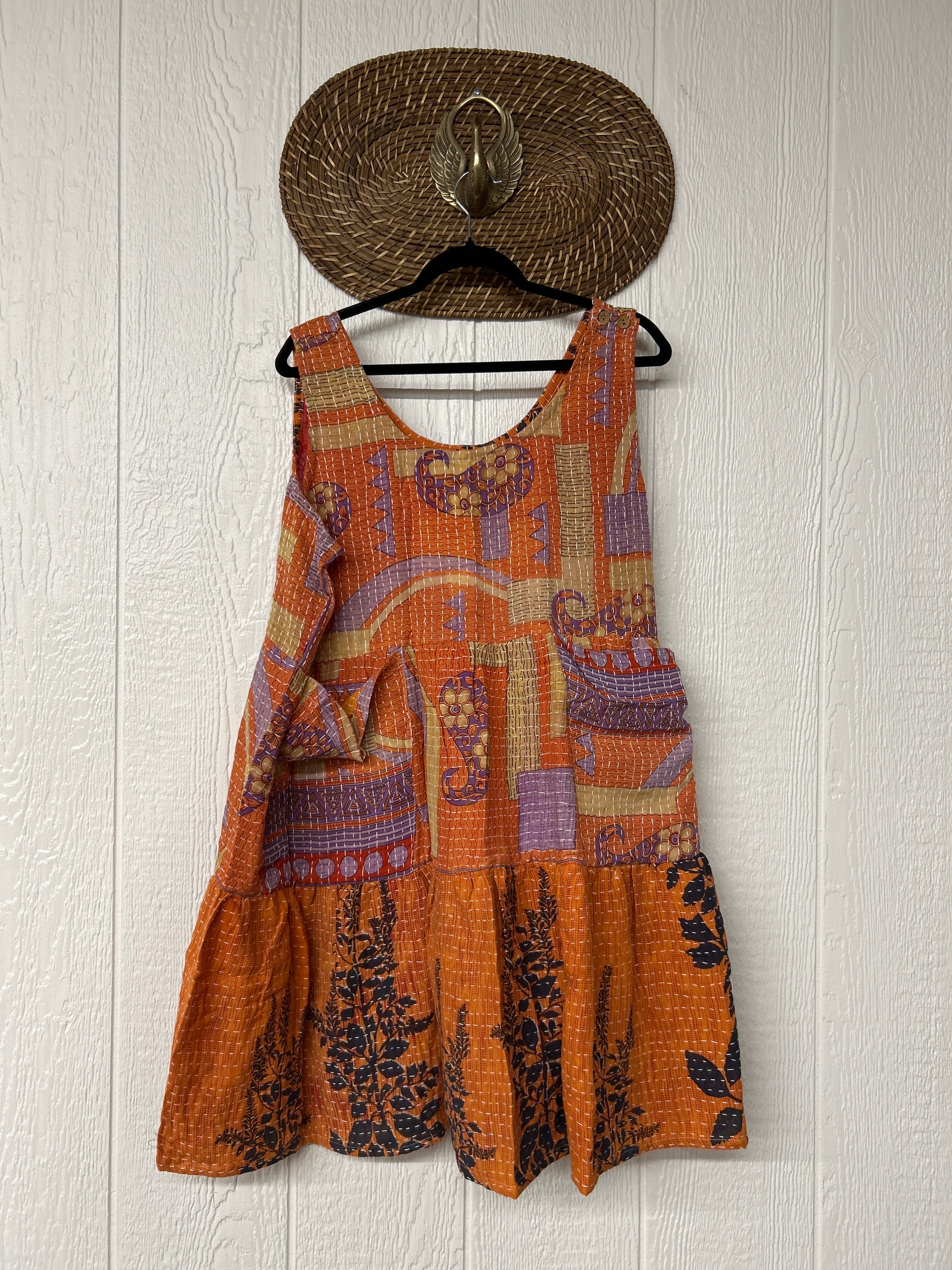 This sweet silhouette is crafted from our ultra lux Kantha stitched cotton sari. The Kantha Meadow Mini Dress features a button closure on the strap, deep interior front pockets, and a tiered bodice for extra twirling dimension!