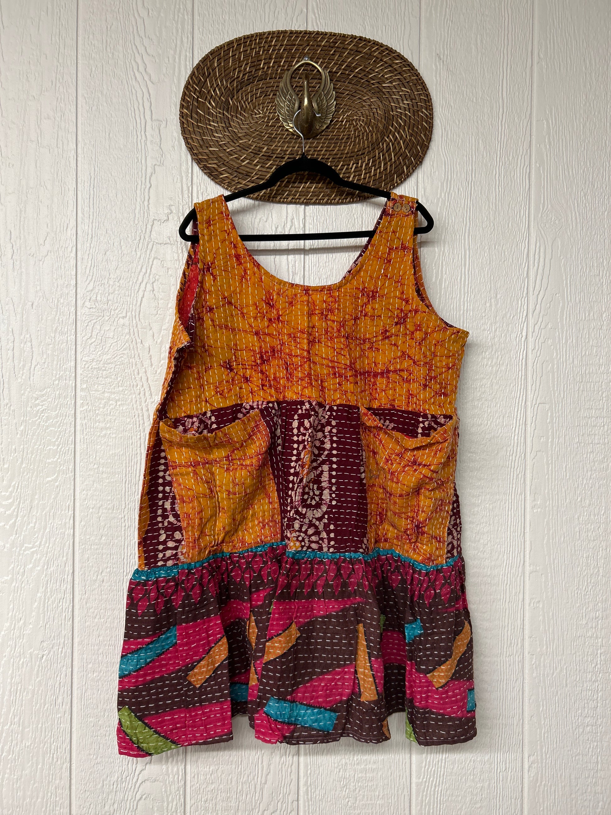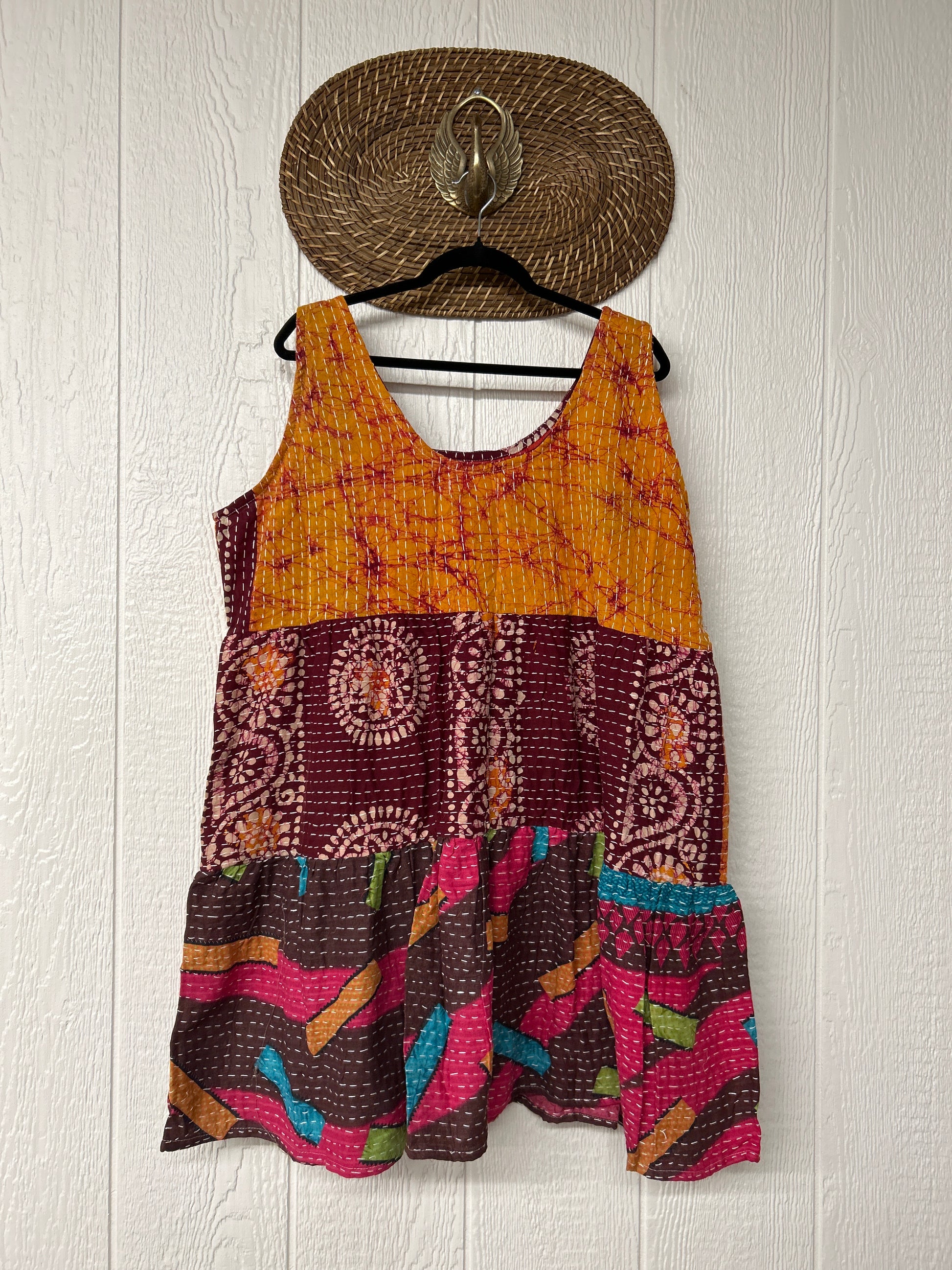 This sweet silhouette is crafted from our ultra lux Kantha stitched cotton sari. The Kantha Meadow Mini Dress features a button closure on the strap, deep interior front pockets, and a tiered bodice for extra twirling dimension!