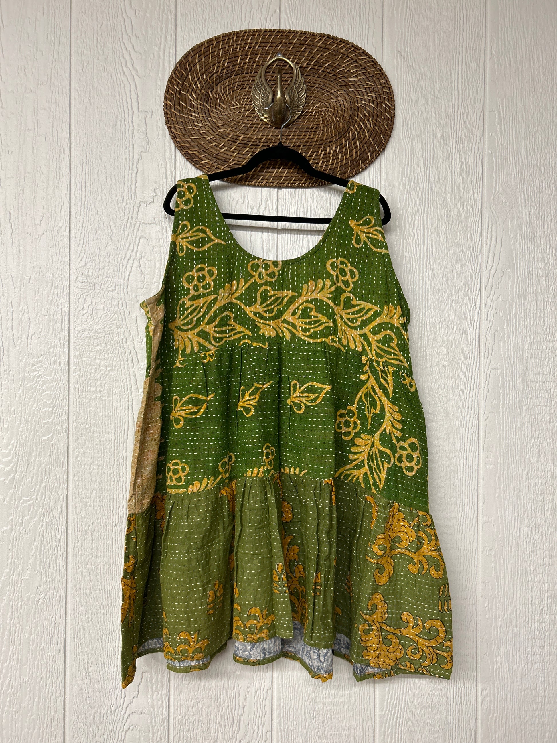This sweet silhouette is crafted from our ultra lux Kantha stitched cotton sari. The Kantha Meadow Mini Dress features a button closure on the strap, deep interior front pockets, and a tiered bodice for extra twirling dimension!