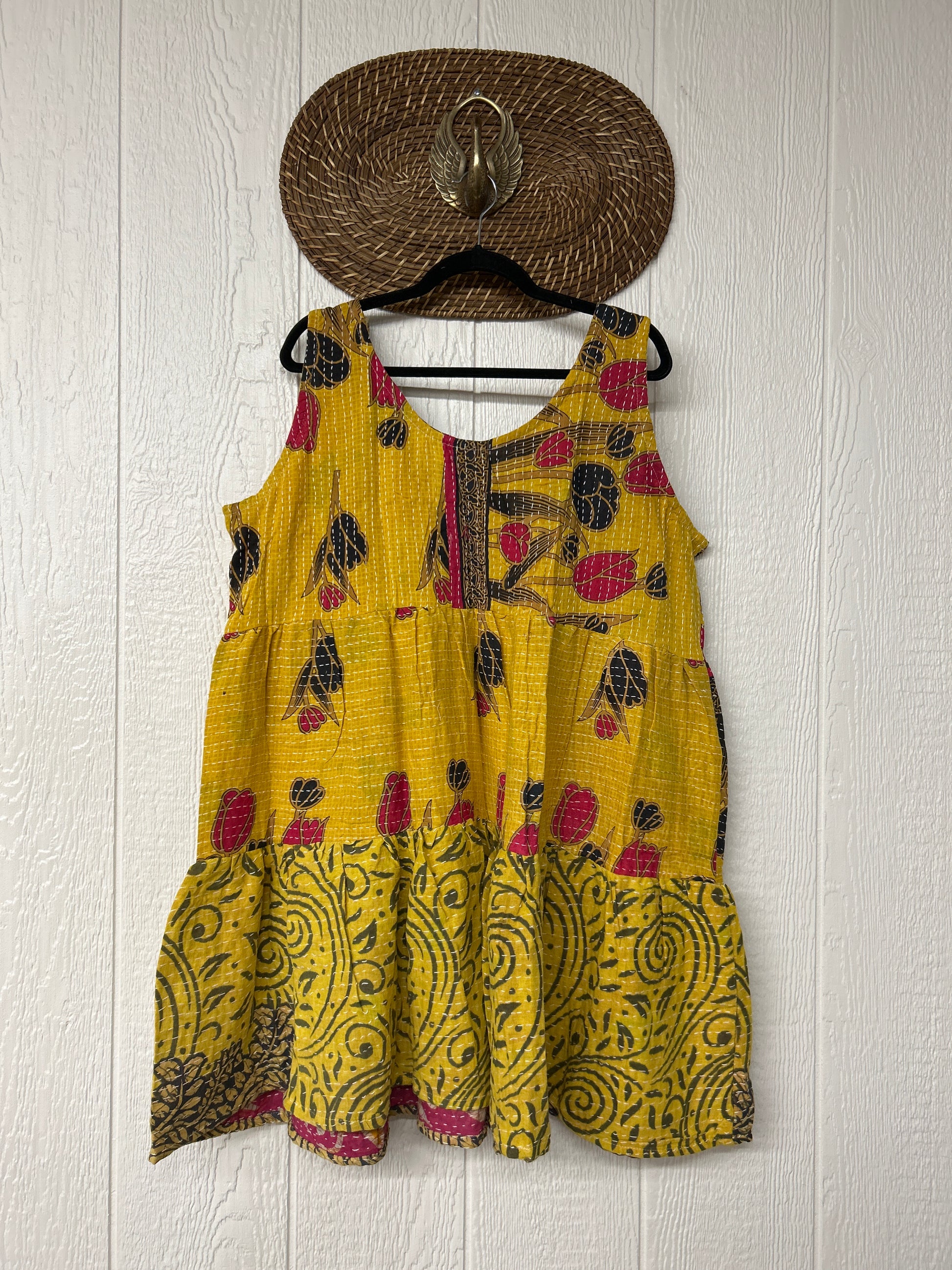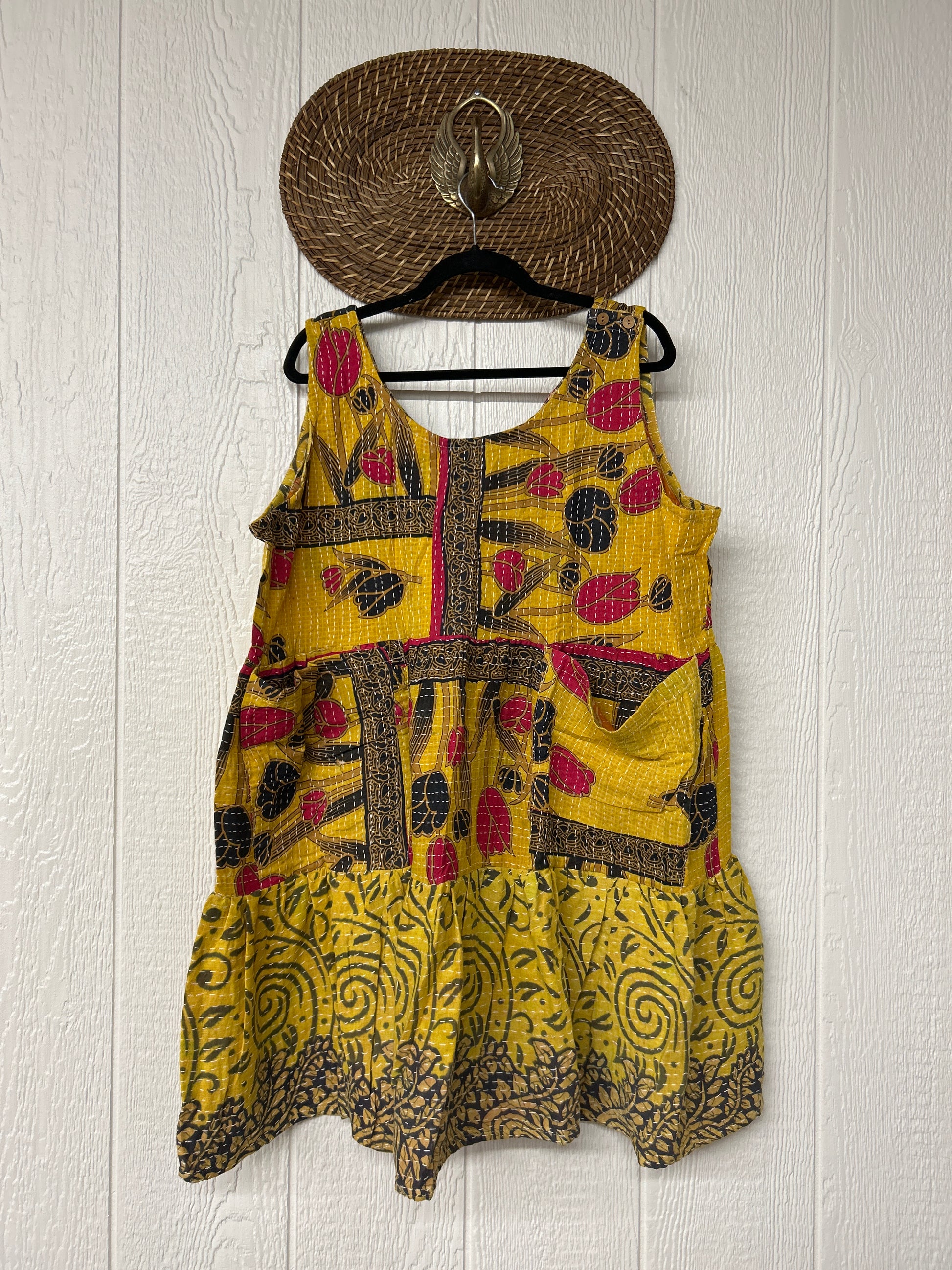 This sweet silhouette is crafted from our ultra lux Kantha stitched cotton sari. The Kantha Meadow Mini Dress features a button closure on the strap, deep interior front pockets, and a tiered bodice for extra twirling dimension!
