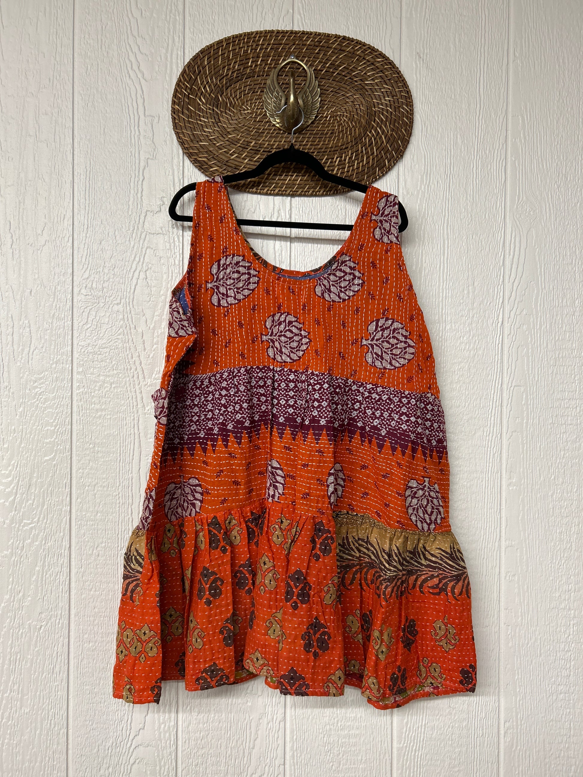 This sweet silhouette is crafted from our ultra lux Kantha stitched cotton sari. The Kantha Meadow Mini Dress features a button closure on the strap, deep interior front pockets, and a tiered bodice for extra twirling dimension!
