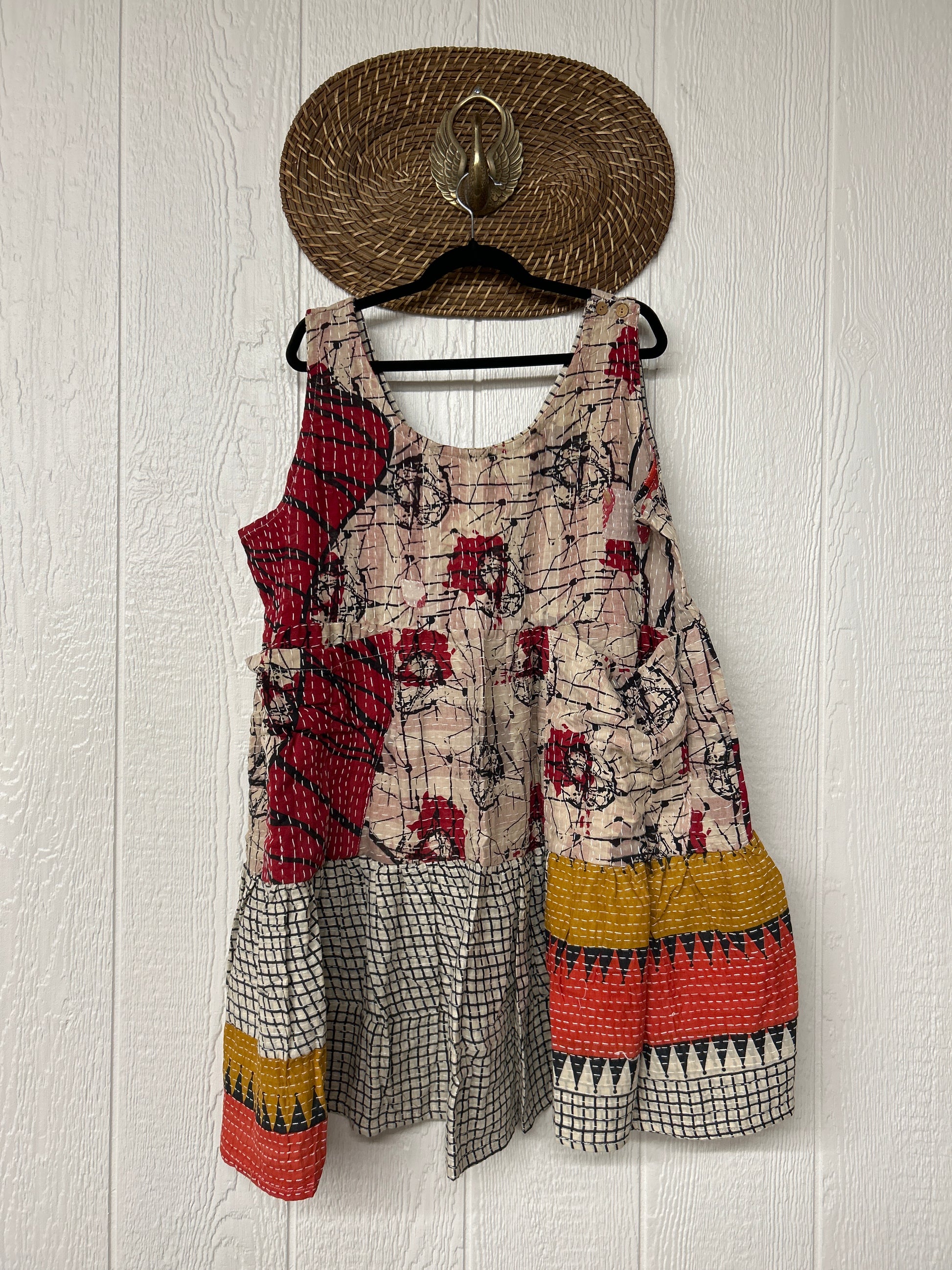 This sweet silhouette is crafted from our ultra lux Kantha stitched cotton sari. The Kantha Meadow Mini Dress features a button closure on the strap, deep interior front pockets, and a tiered bodice for extra twirling dimension!