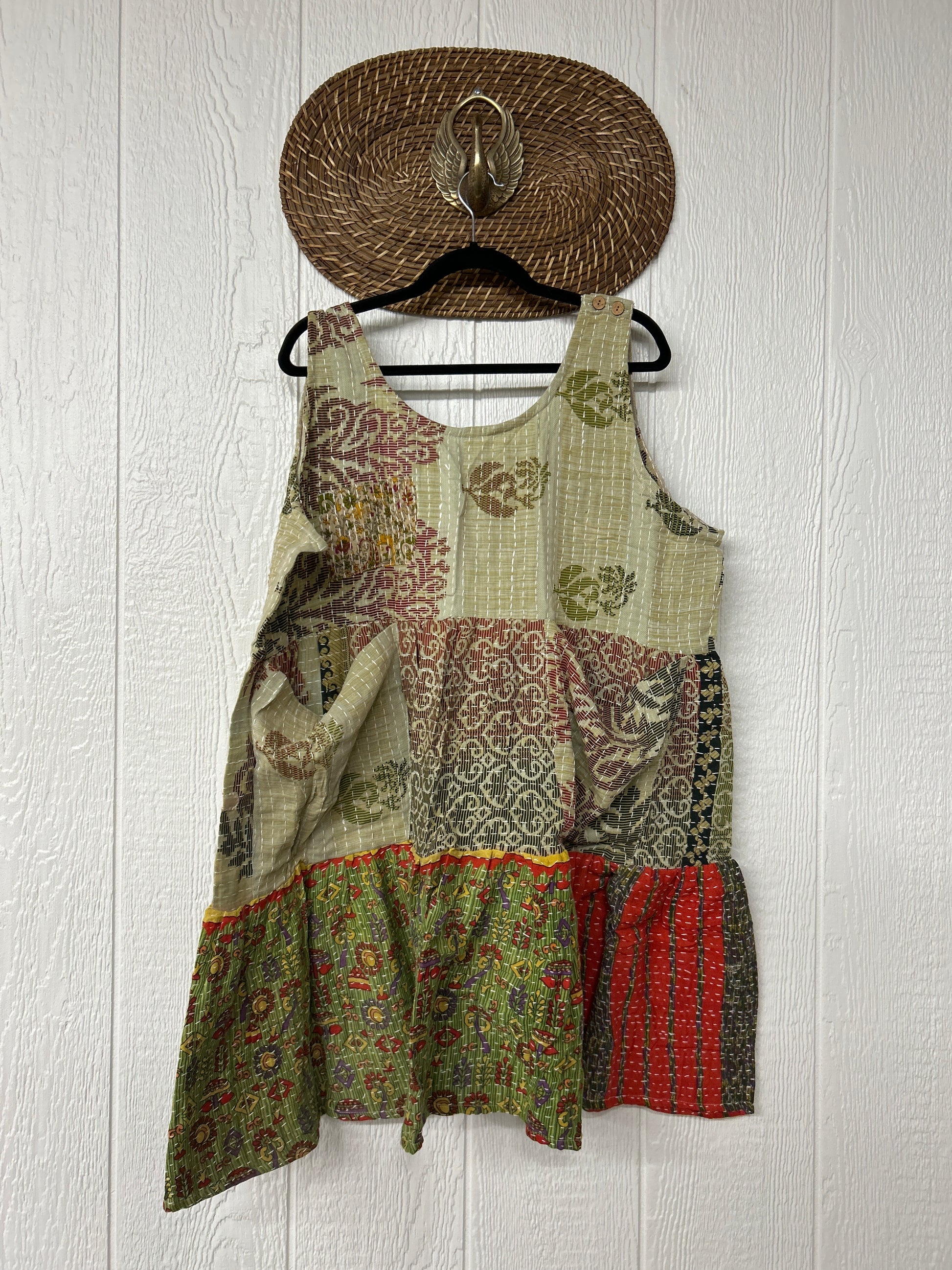 This sweet silhouette is crafted from our ultra lux Kantha stitched cotton sari. The Kantha Meadow Mini Dress features a button closure on the strap, deep interior front pockets, and a tiered bodice for extra twirling dimension!