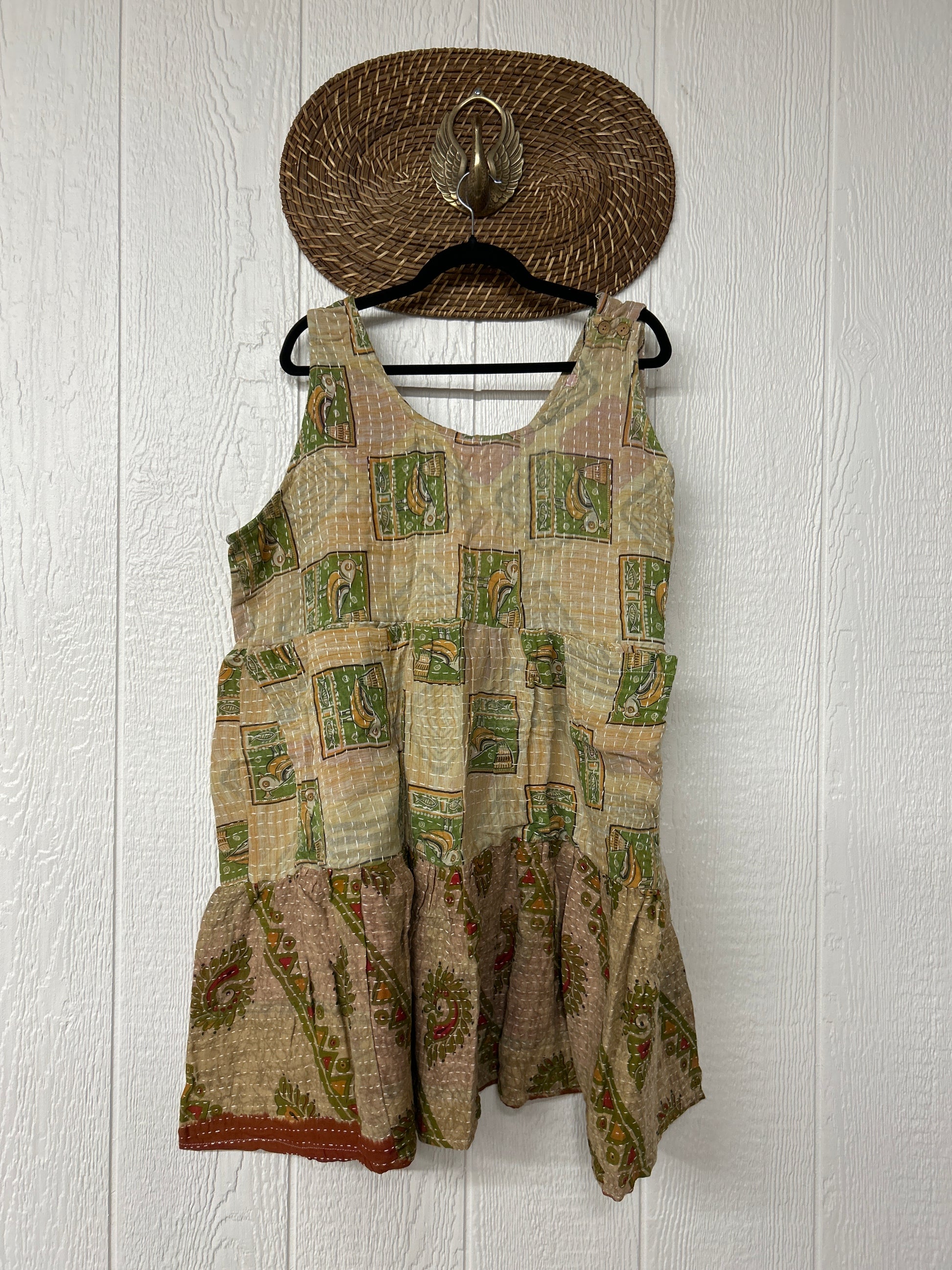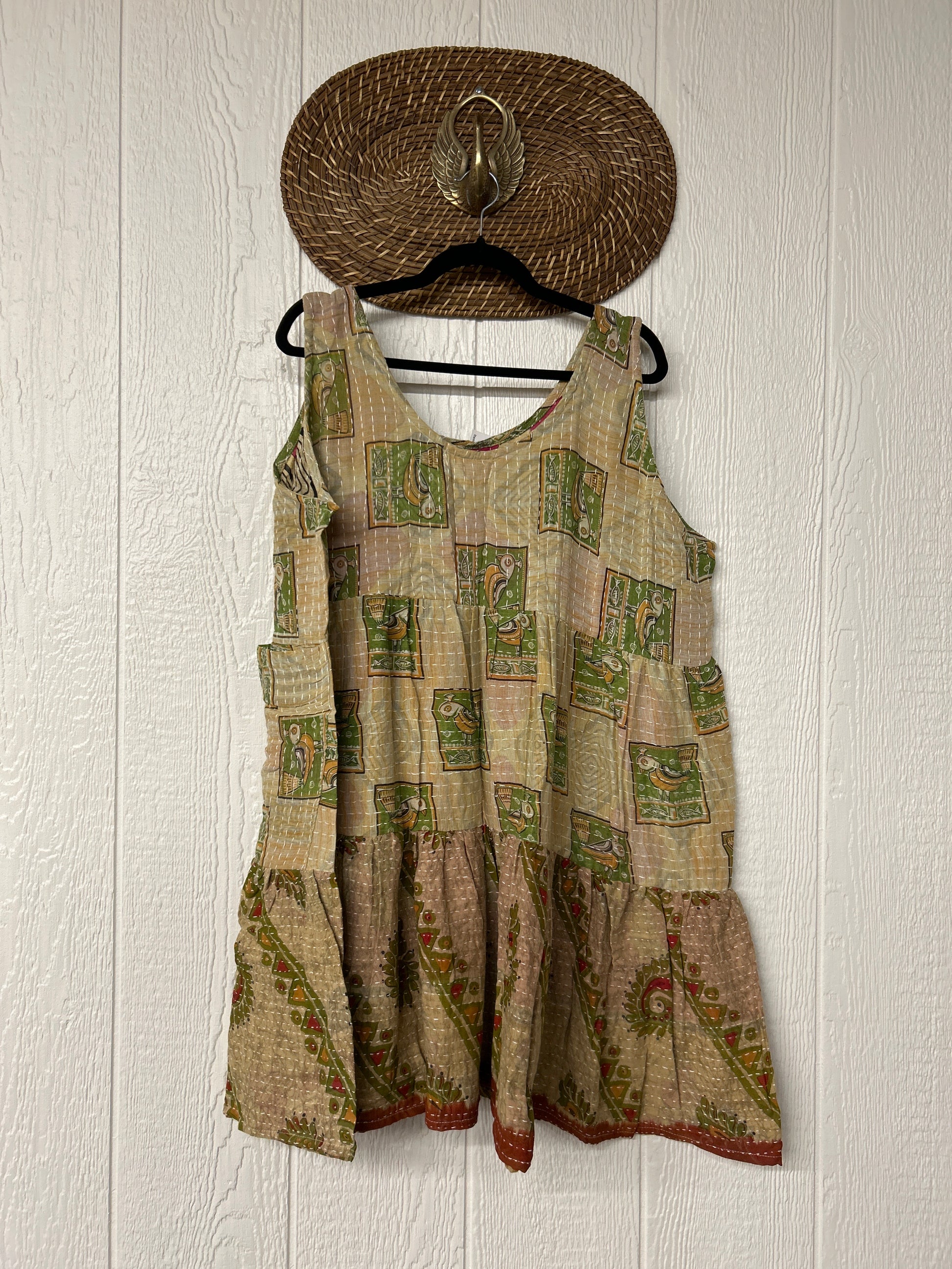 This sweet silhouette is crafted from our ultra lux Kantha stitched cotton sari. The Kantha Meadow Mini Dress features a button closure on the strap, deep interior front pockets, and a tiered bodice for extra twirling dimension!