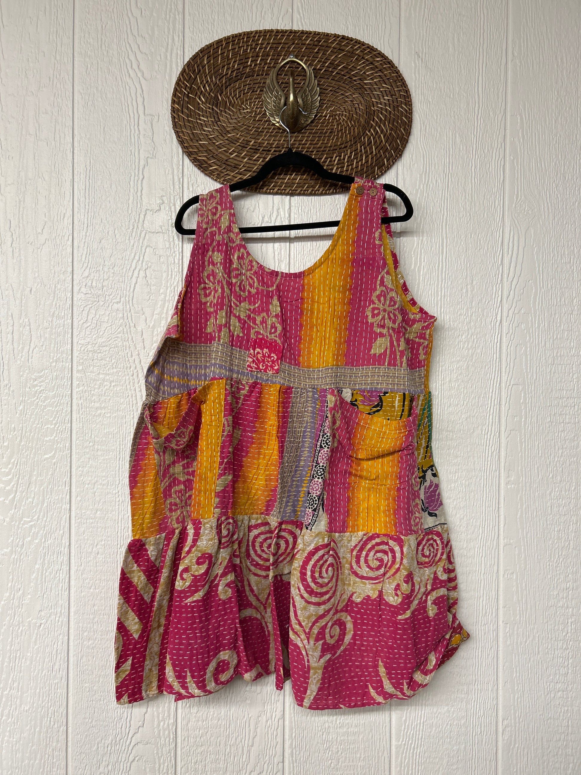 This sweet silhouette is crafted from our ultra lux Kantha stitched cotton sari. The Kantha Meadow Mini Dress features a button closure on the strap, deep interior front pockets, and a tiered bodice for extra twirling dimension!