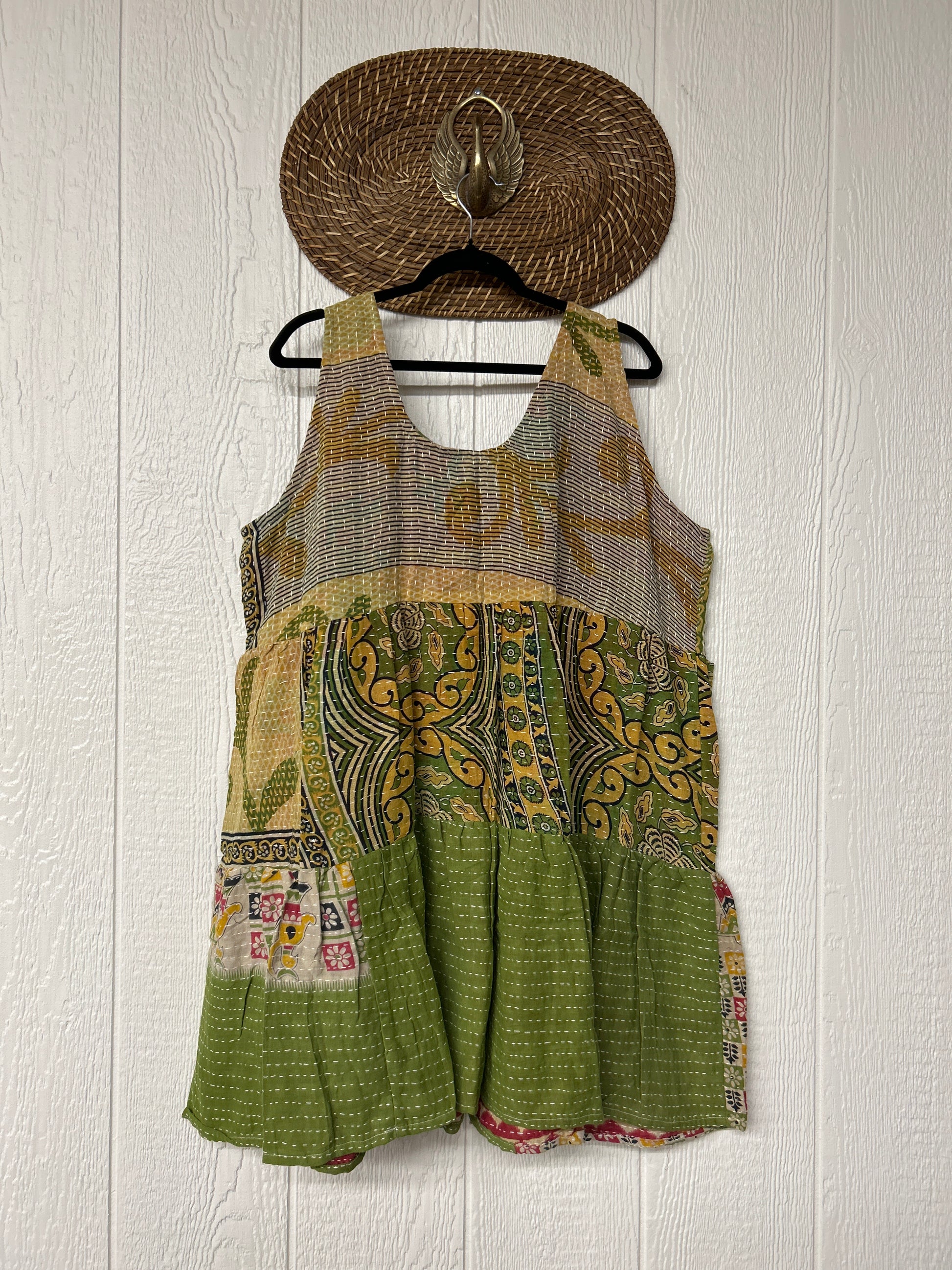 This sweet silhouette is crafted from our ultra lux Kantha stitched cotton sari. The Kantha Meadow Mini Dress features a button closure on the strap, deep interior front pockets, and a tiered bodice for extra twirling dimension!