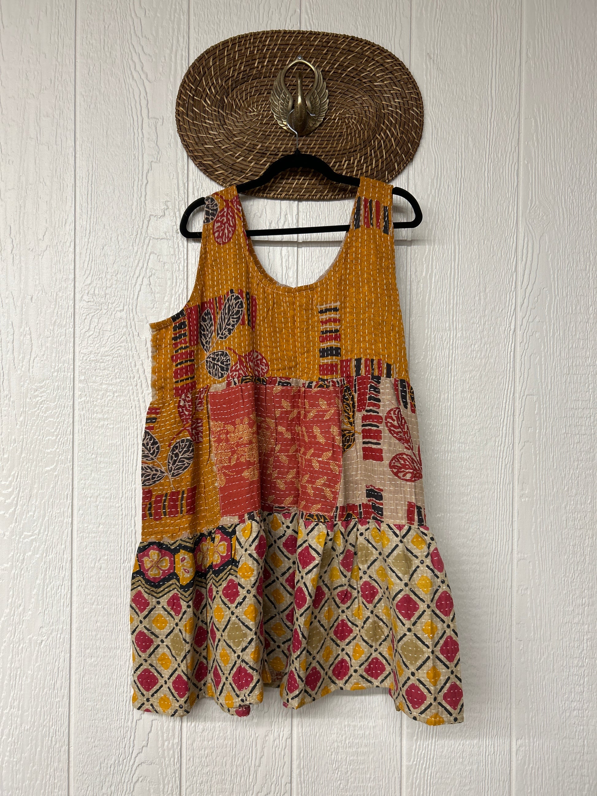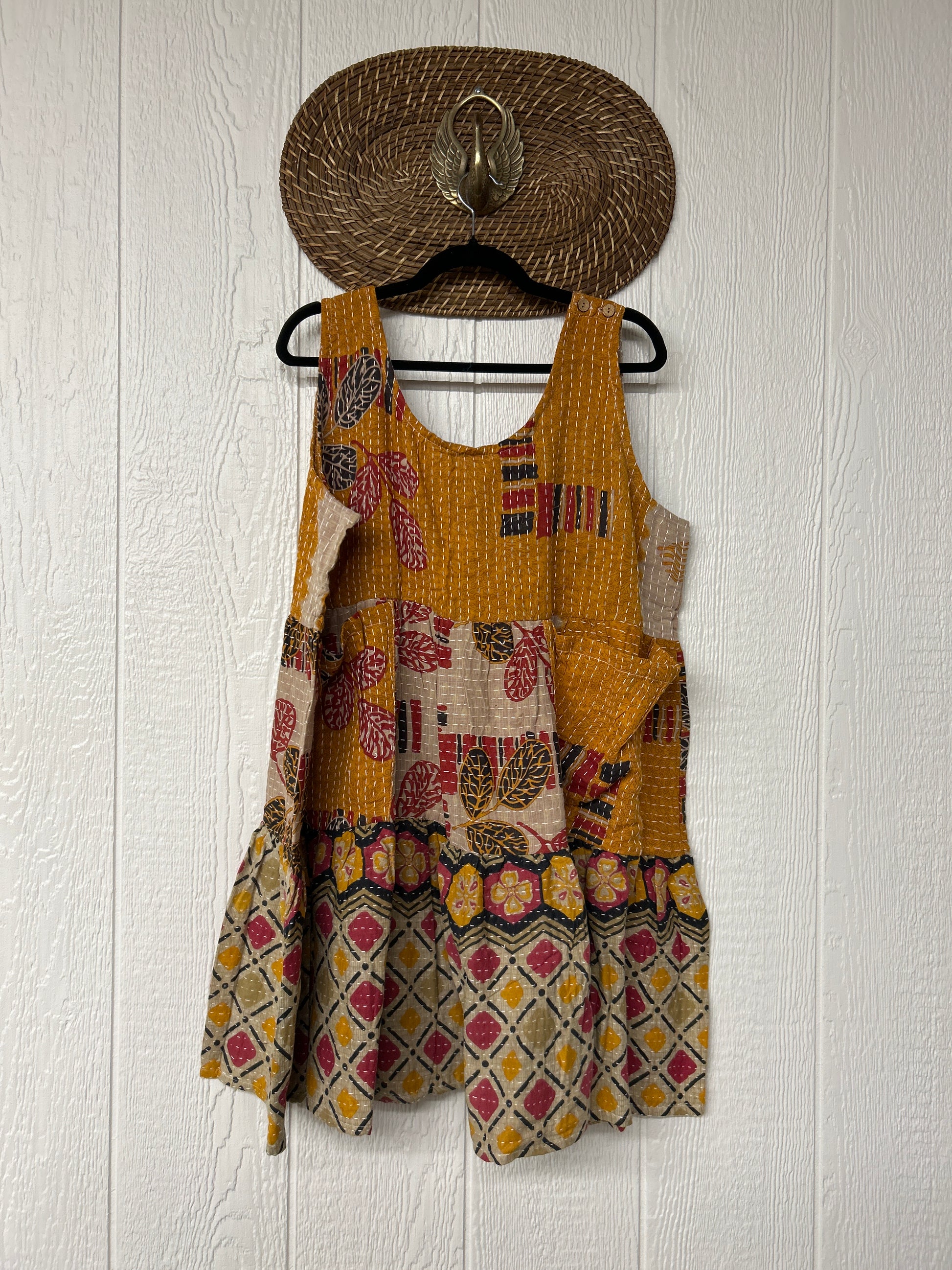 This sweet silhouette is crafted from our ultra lux Kantha stitched cotton sari. The Kantha Meadow Mini Dress features a button closure on the strap, deep interior front pockets, and a tiered bodice for extra twirling dimension!