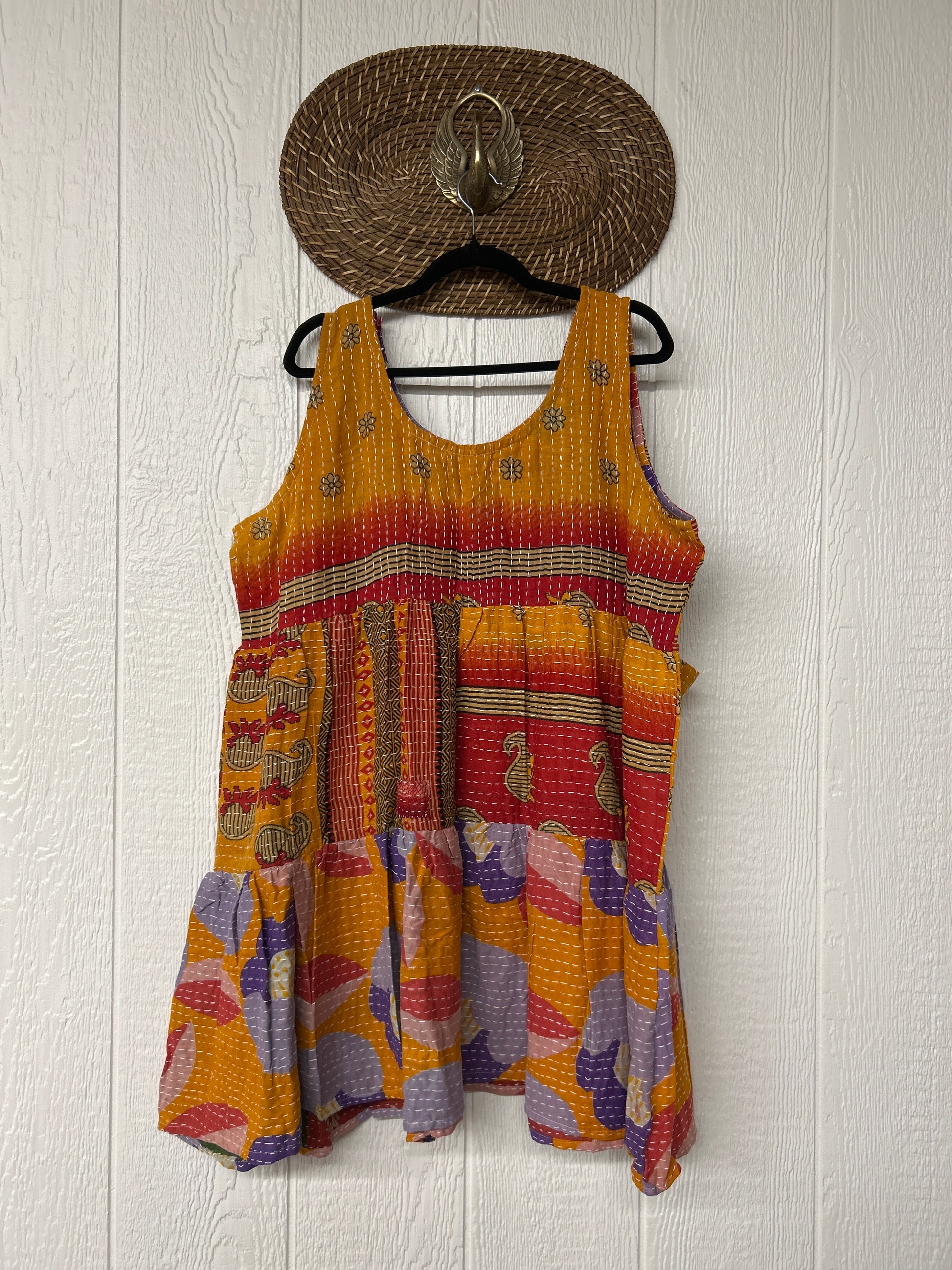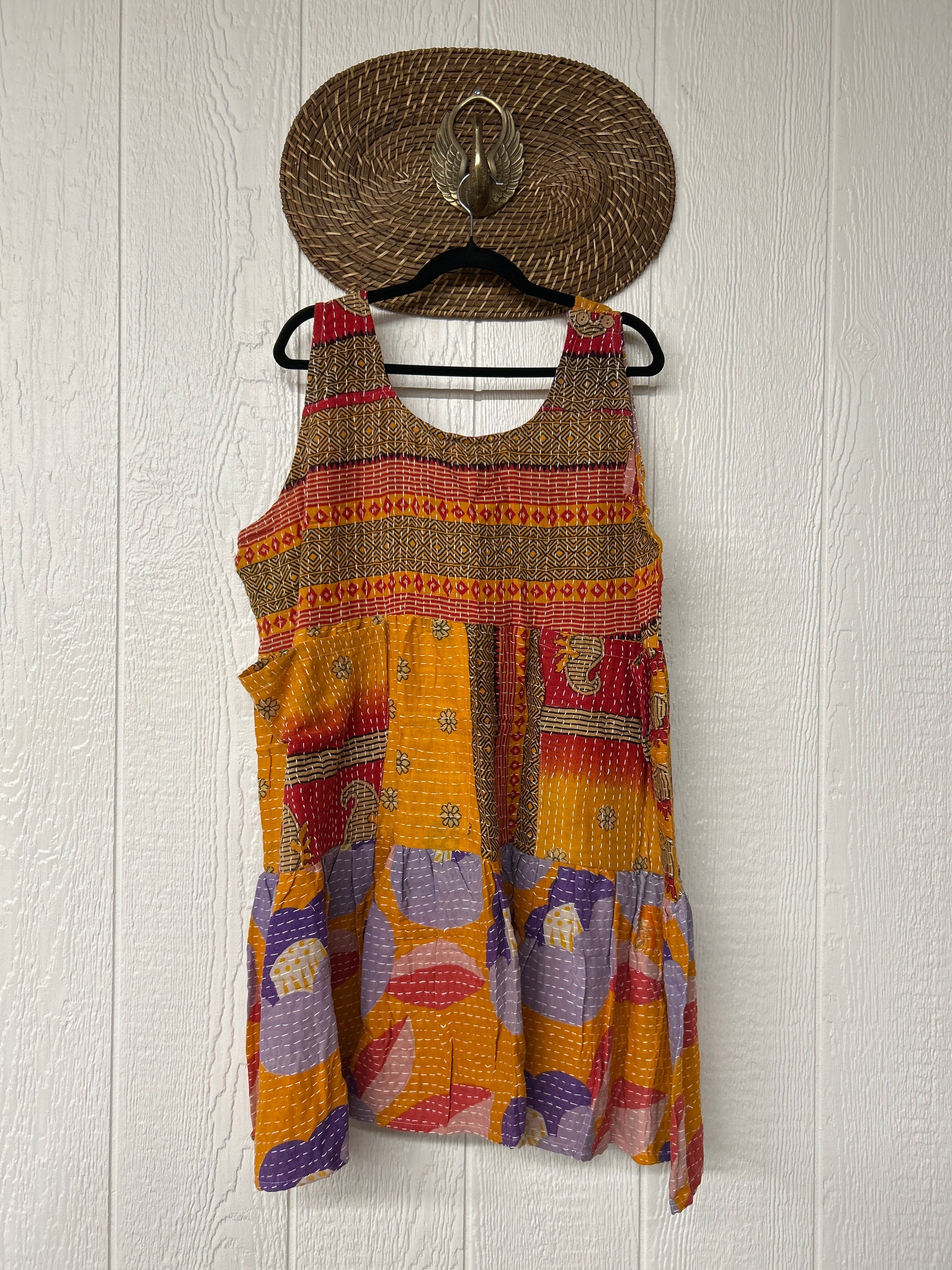 This sweet silhouette is crafted from our ultra lux Kantha stitched cotton sari. The Kantha Meadow Mini Dress features a button closure on the strap, deep interior front pockets, and a tiered bodice for extra twirling dimension!
