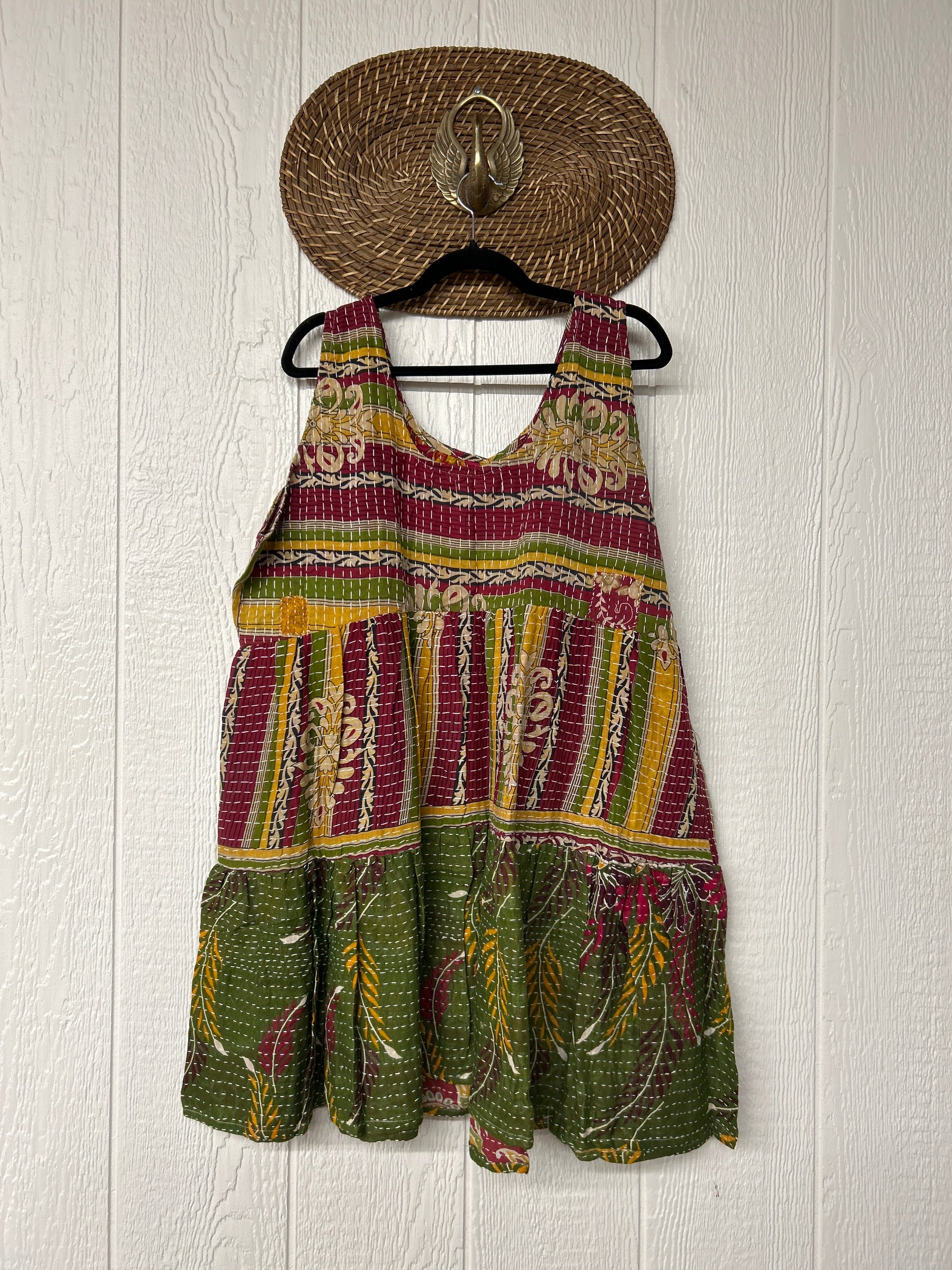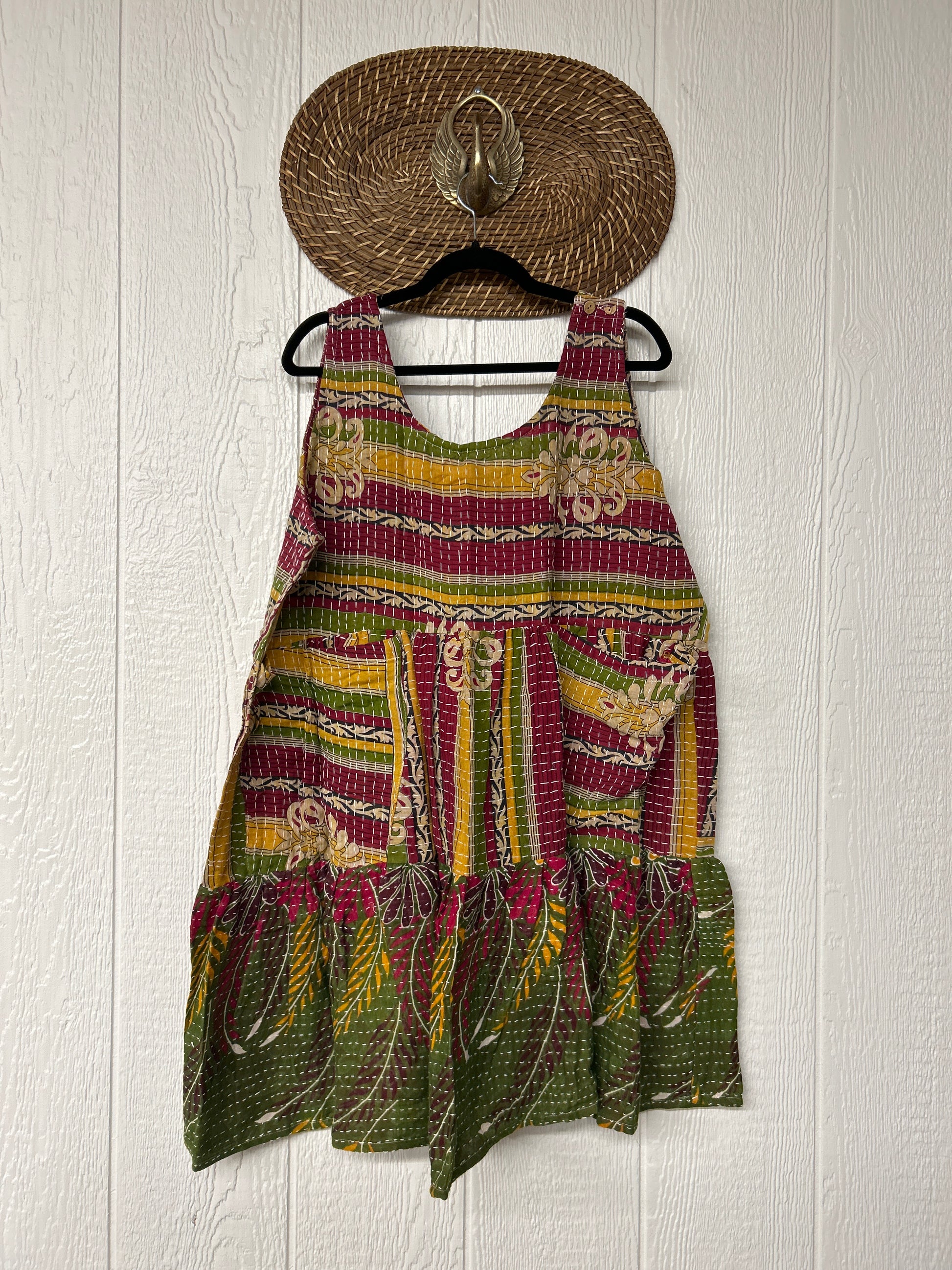 This sweet silhouette is crafted from our ultra lux Kantha stitched cotton sari. The Kantha Meadow Mini Dress features a button closure on the strap, deep interior front pockets, and a tiered bodice for extra twirling dimension!