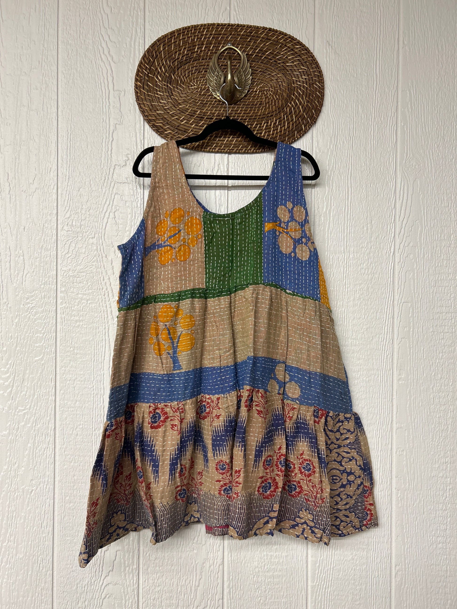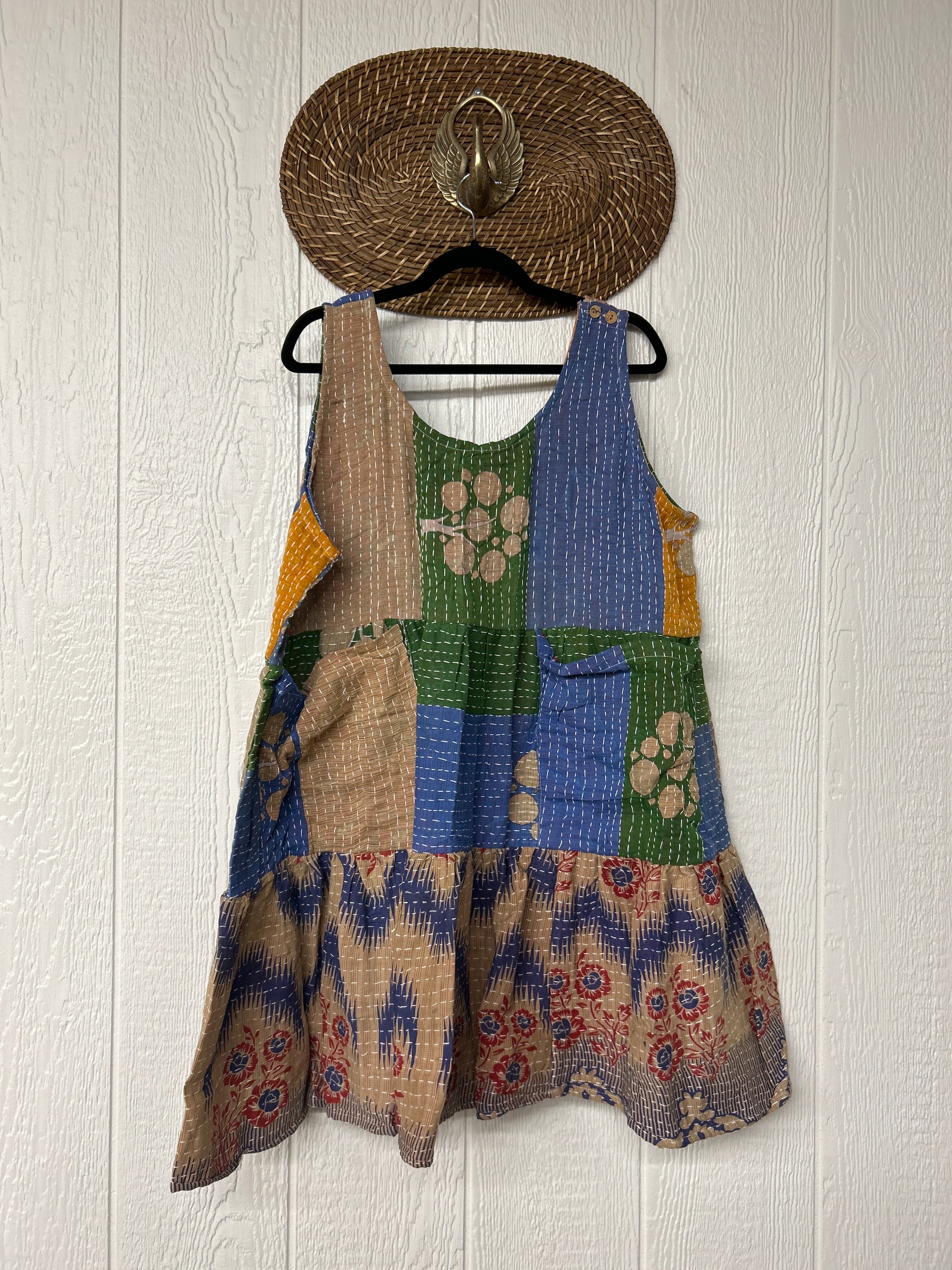 This sweet silhouette is crafted from our ultra lux Kantha stitched cotton sari. The Kantha Meadow Mini Dress features a button closure on the strap, deep interior front pockets, and a tiered bodice for extra twirling dimension!