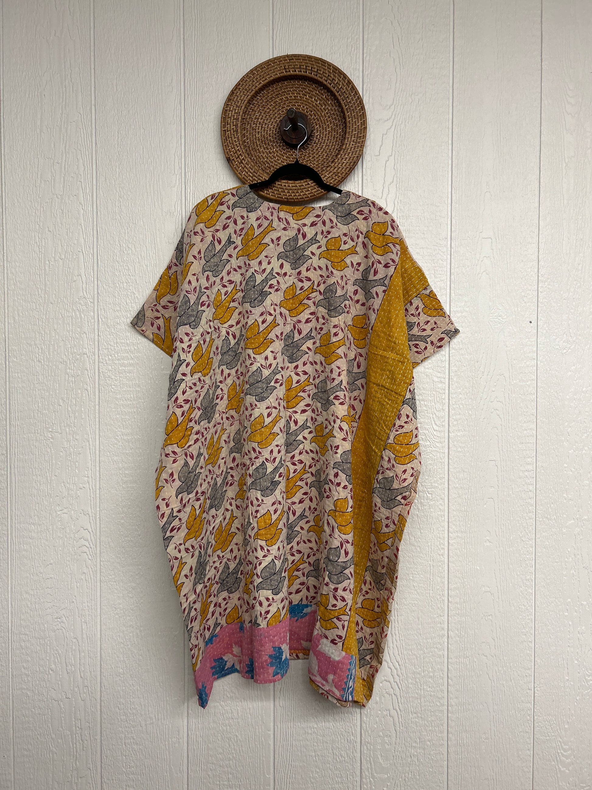 Crafted in our lux vintage Kantha stitch cotton sari, this floaty muu is in a new midi length with buttons at the neckline and slouchy exterior pockets.