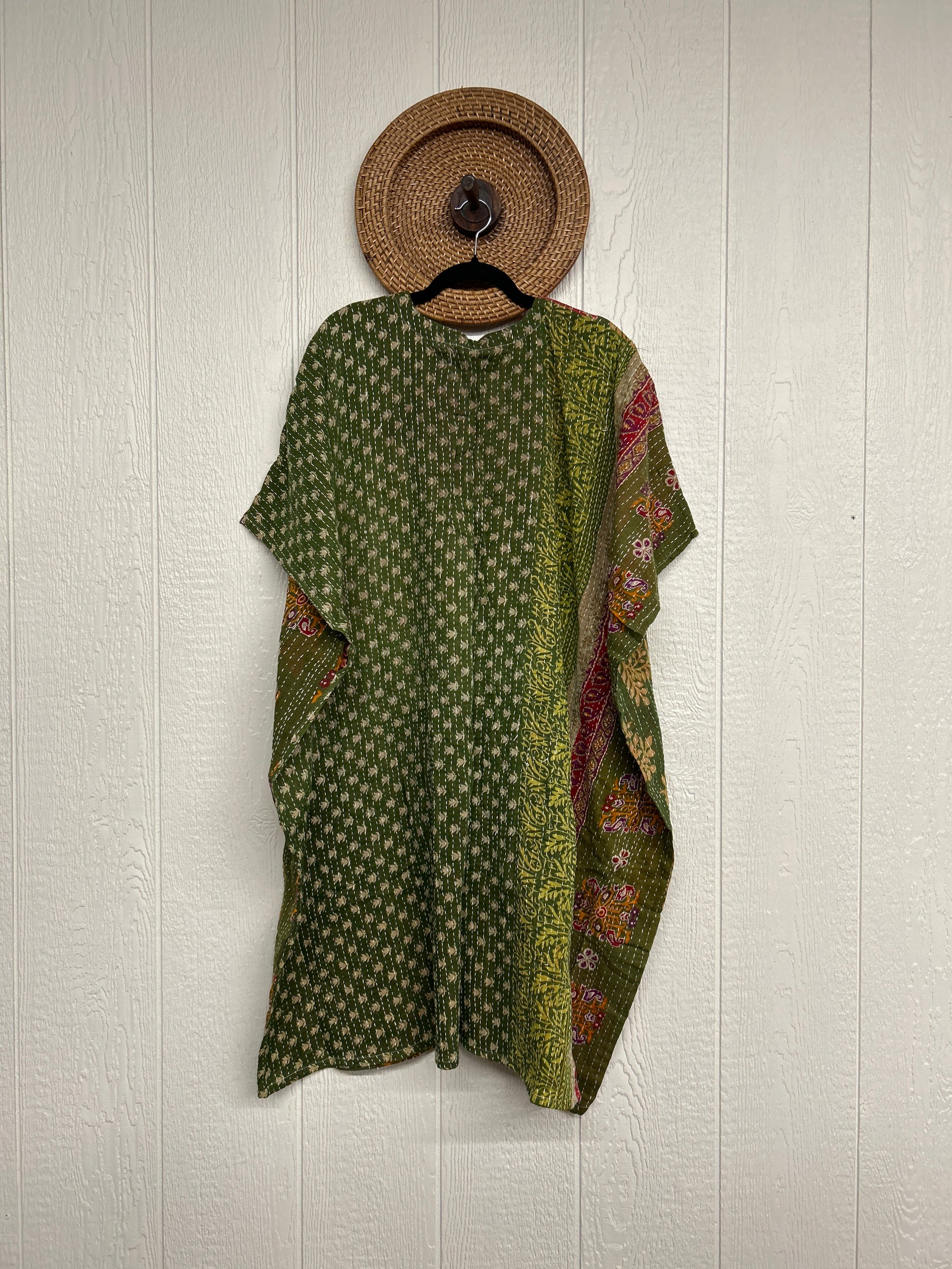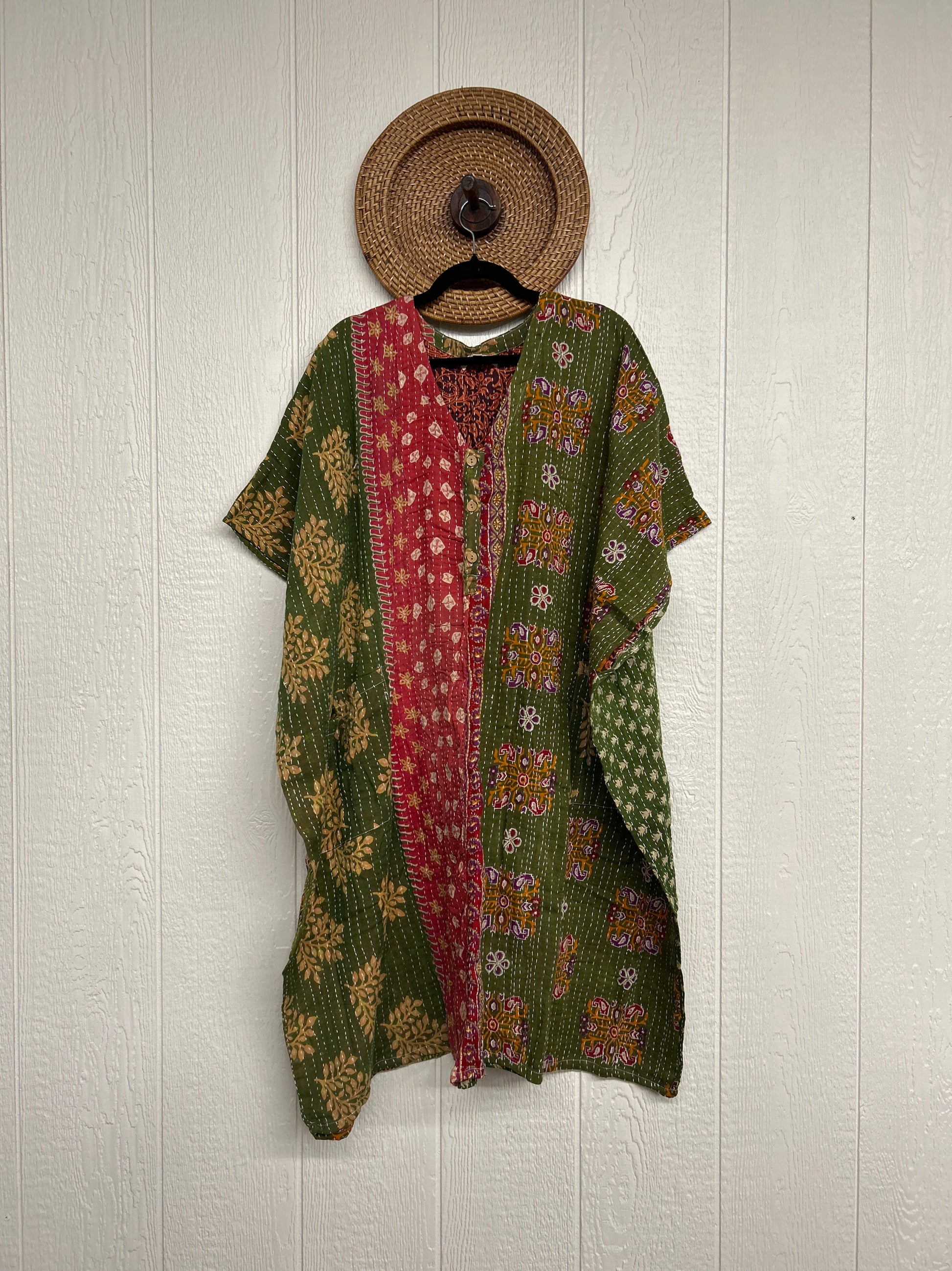 Crafted in our lux vintage Kantha stitch cotton sari, this floaty muu is in a new midi length with buttons at the neckline and slouchy exterior pockets.