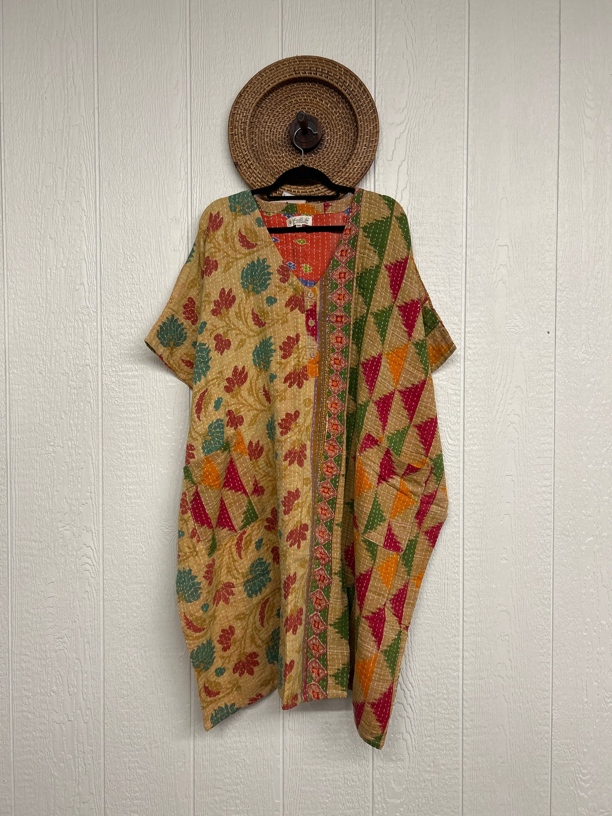 Crafted in our lux vintage Kantha stitch cotton sari, this floaty muu is in a new midi length with buttons at the neckline and slouchy exterior pockets.