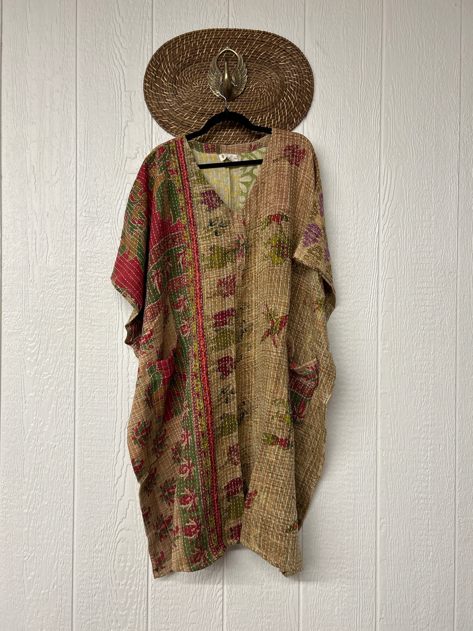 Crafted in our lux vintage Kantha stitch cotton sari, this floaty muu is in a new midi length with buttons at the neckline and slouchy exterior pockets.