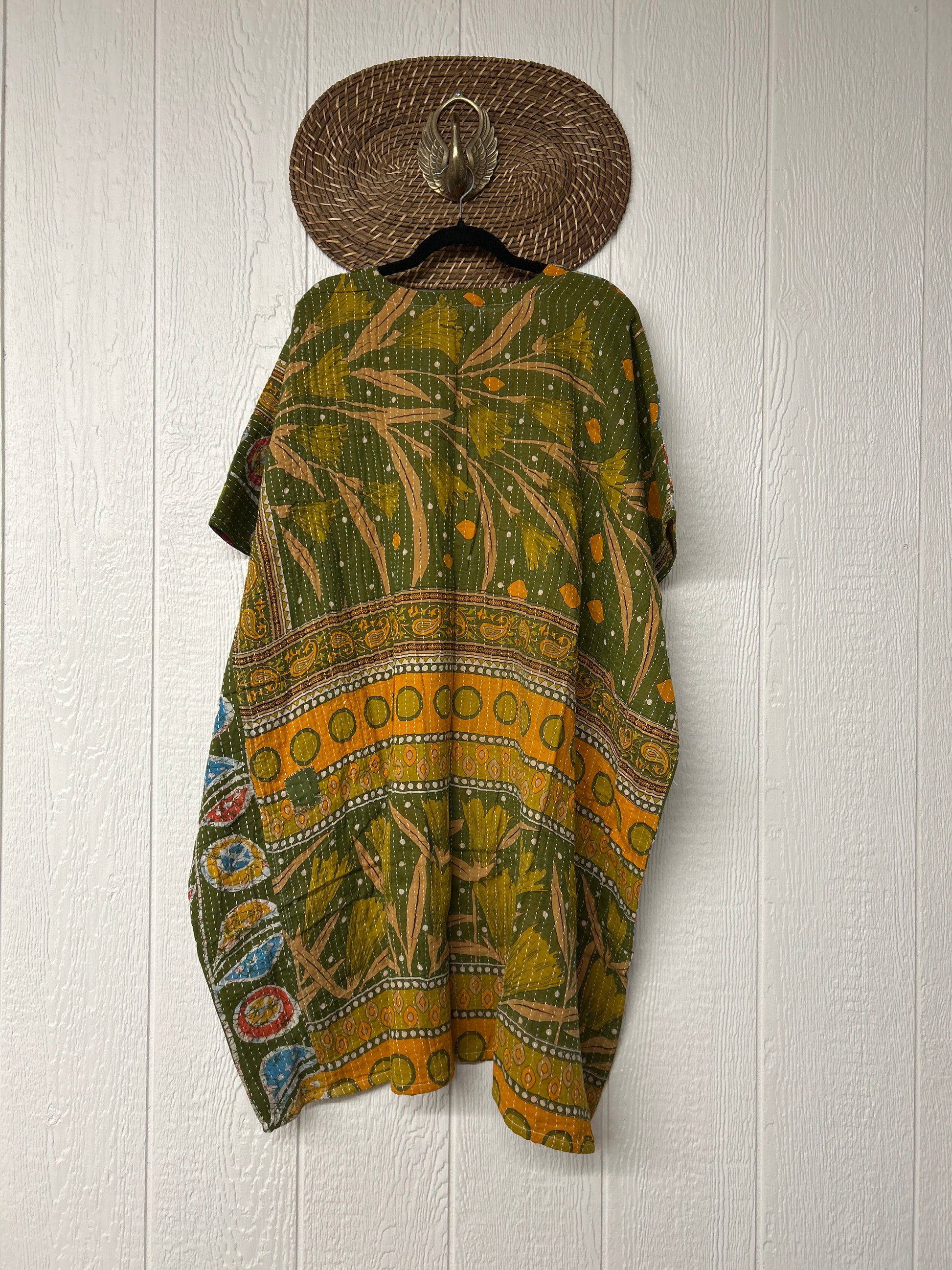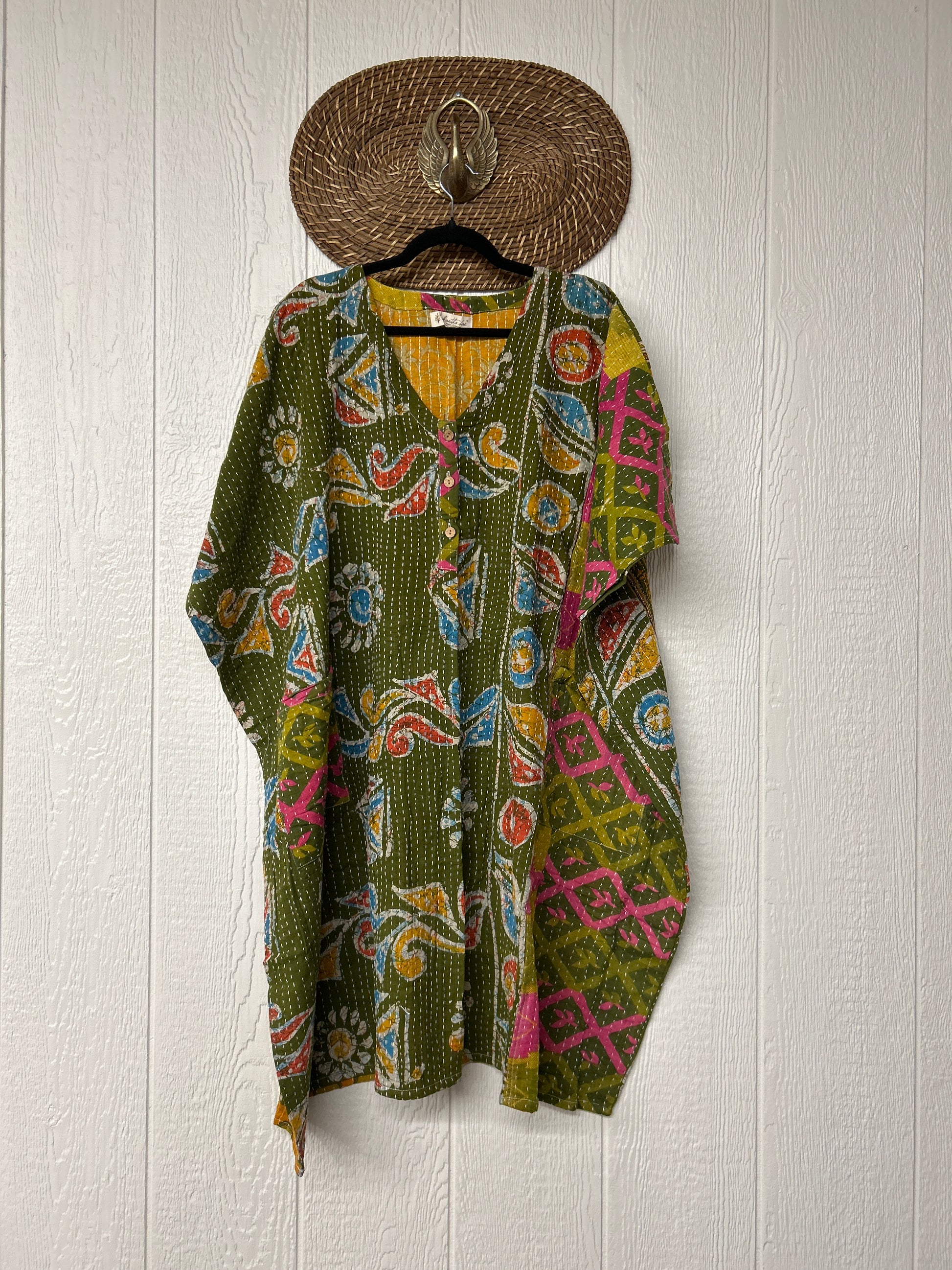 Crafted in our lux vintage Kantha stitch cotton sari, this floaty muu is in a new midi length with buttons at the neckline and slouchy exterior pockets.