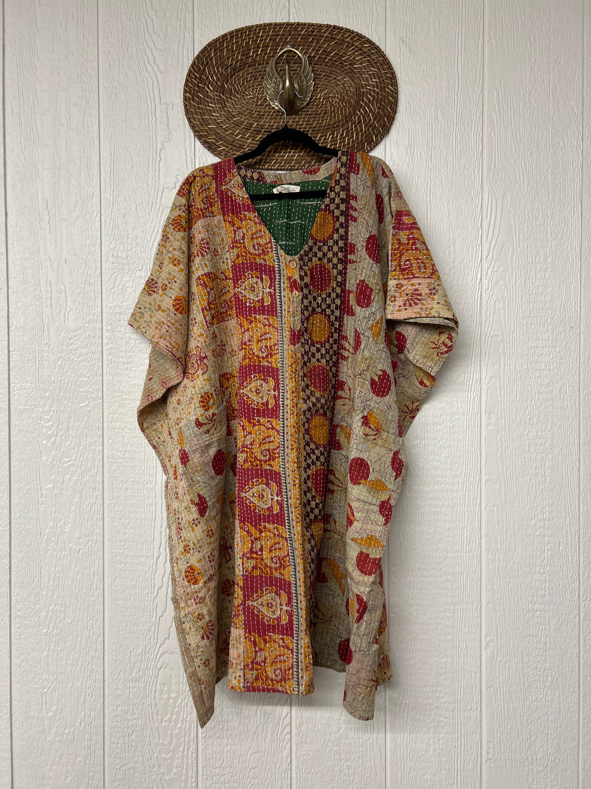 Crafted in our lux vintage Kantha stitch cotton sari, this floaty muu is in a new midi length with buttons at the neckline and slouchy exterior pockets.