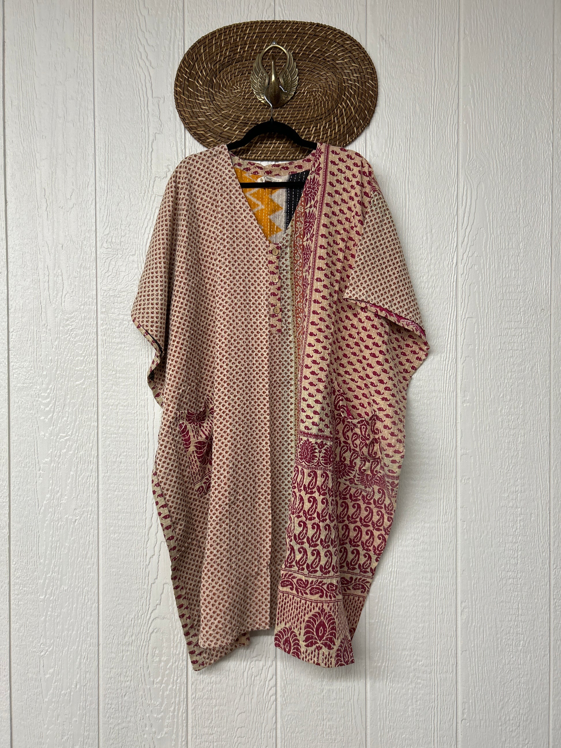 Crafted in our lux vintage Kantha stitch cotton sari, this floaty muu is in a new midi length with buttons at the neckline and slouchy exterior pockets.