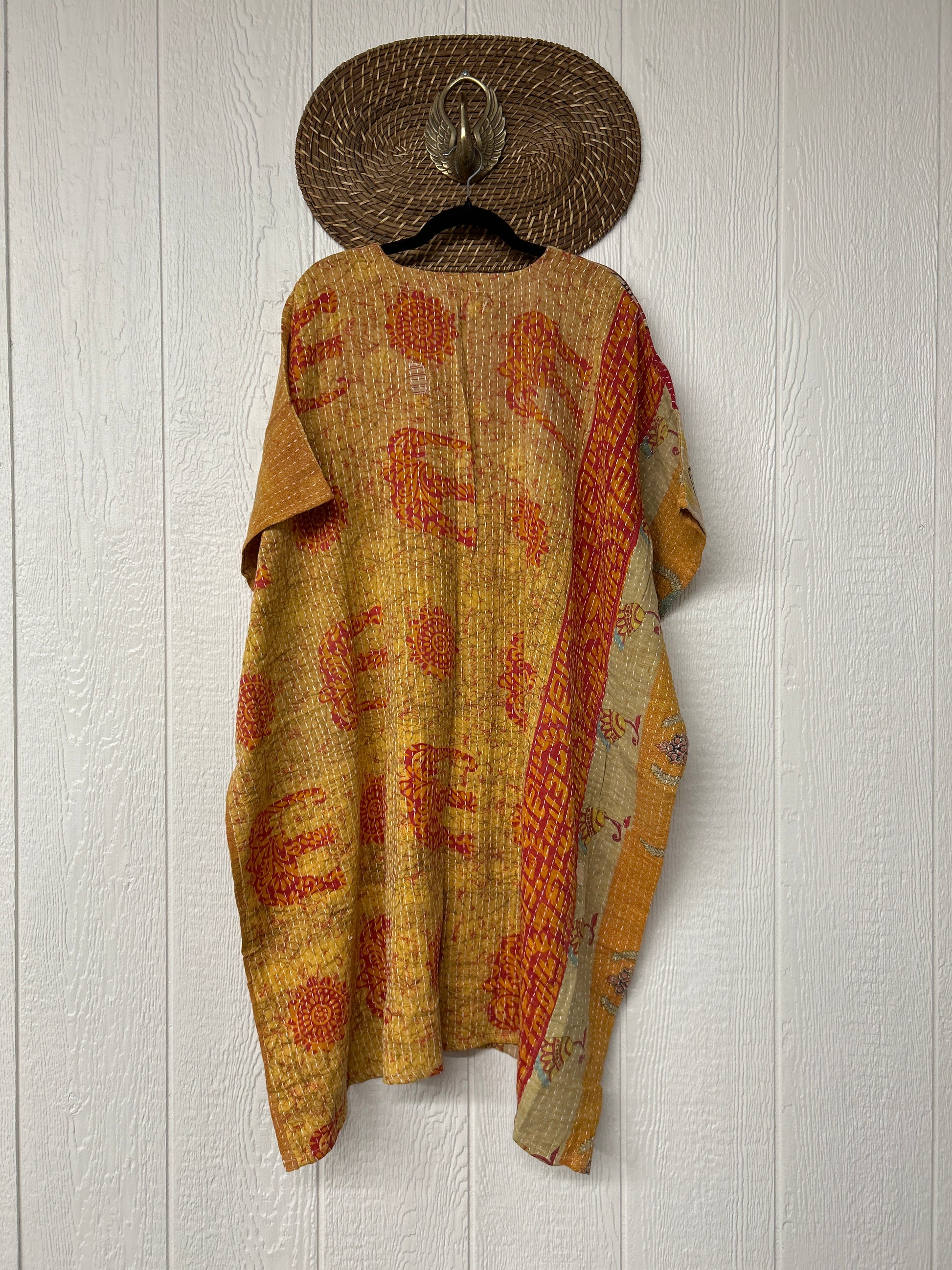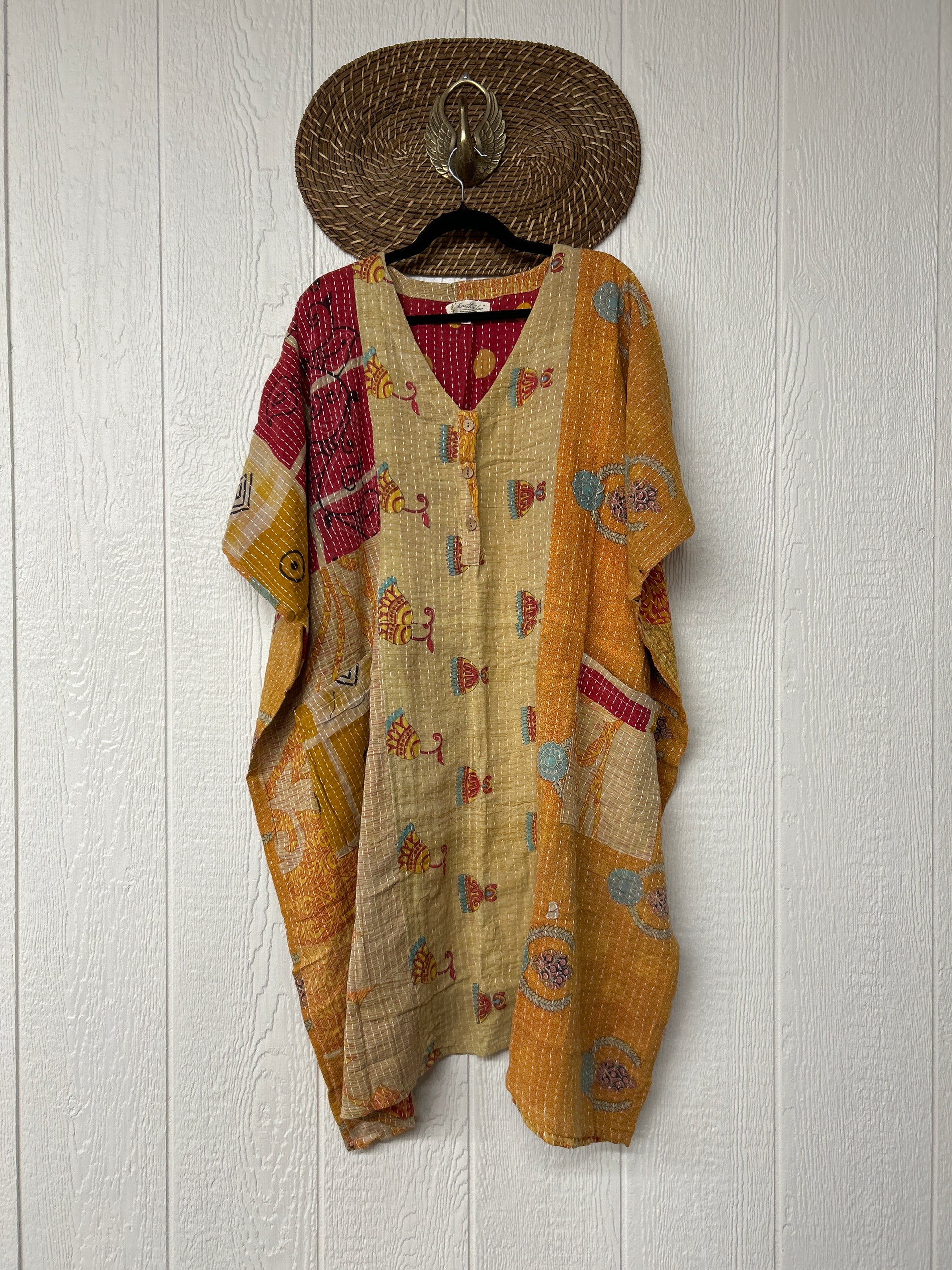 Crafted in our lux vintage Kantha stitch cotton sari, this floaty muu is in a new midi length with buttons at the neckline and slouchy exterior pockets.
