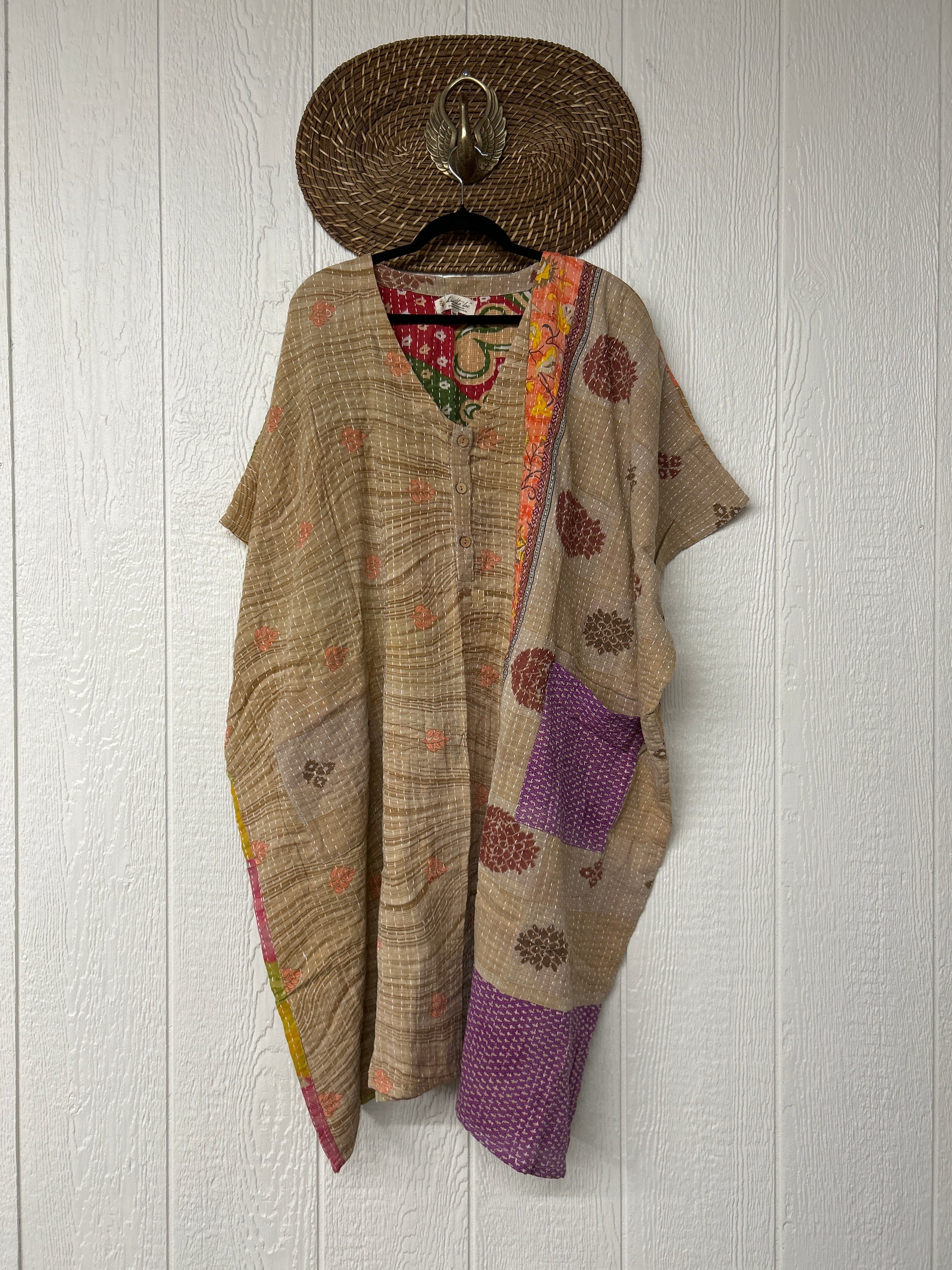 Crafted in our lux vintage Kantha stitch cotton sari, this floaty muu is in a new midi length with buttons at the neckline and slouchy exterior pockets.