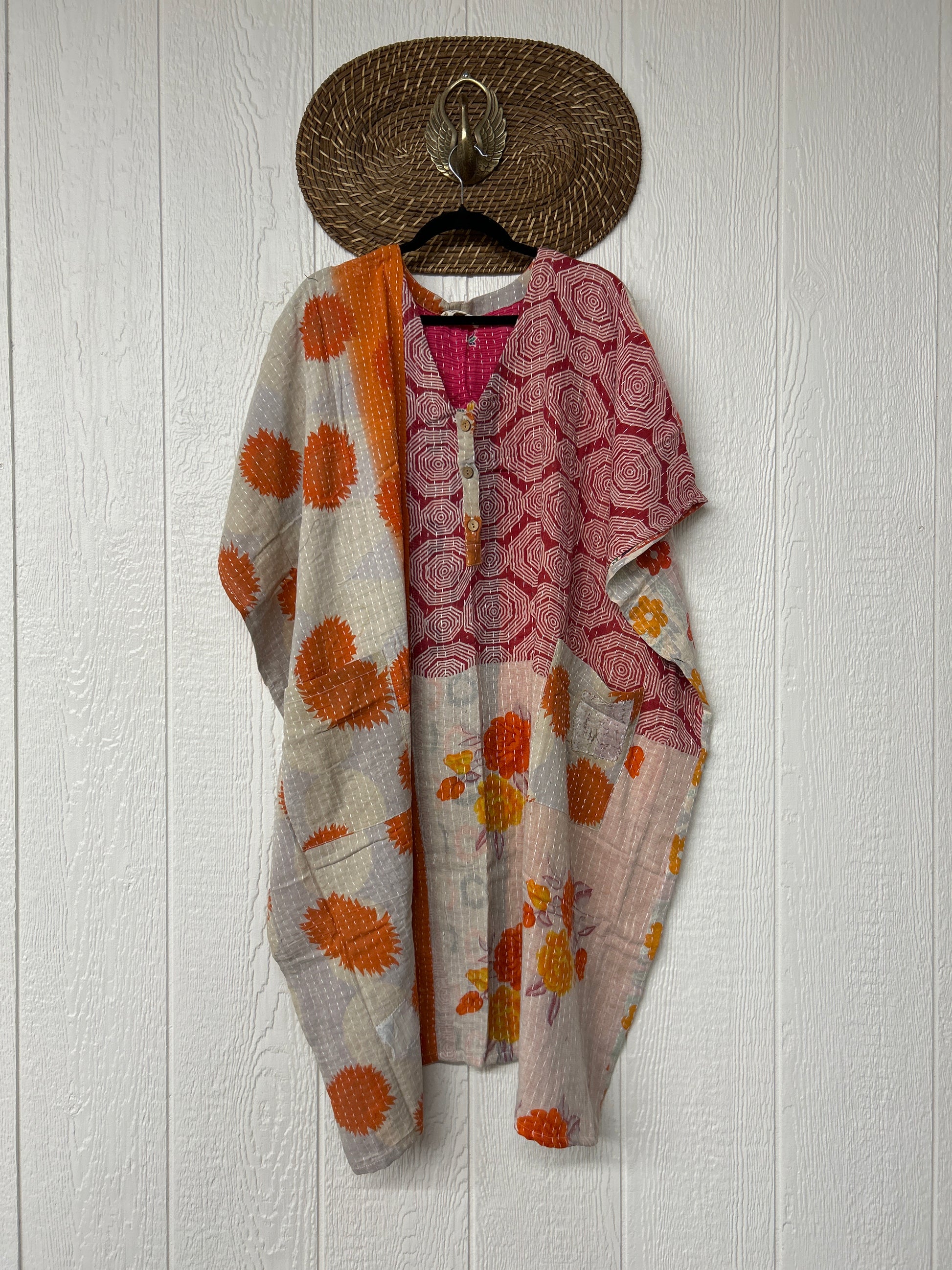 Crafted in our lux vintage Kantha stitch cotton sari, this floaty muu is in a new midi length with buttons at the neckline and slouchy exterior pockets.