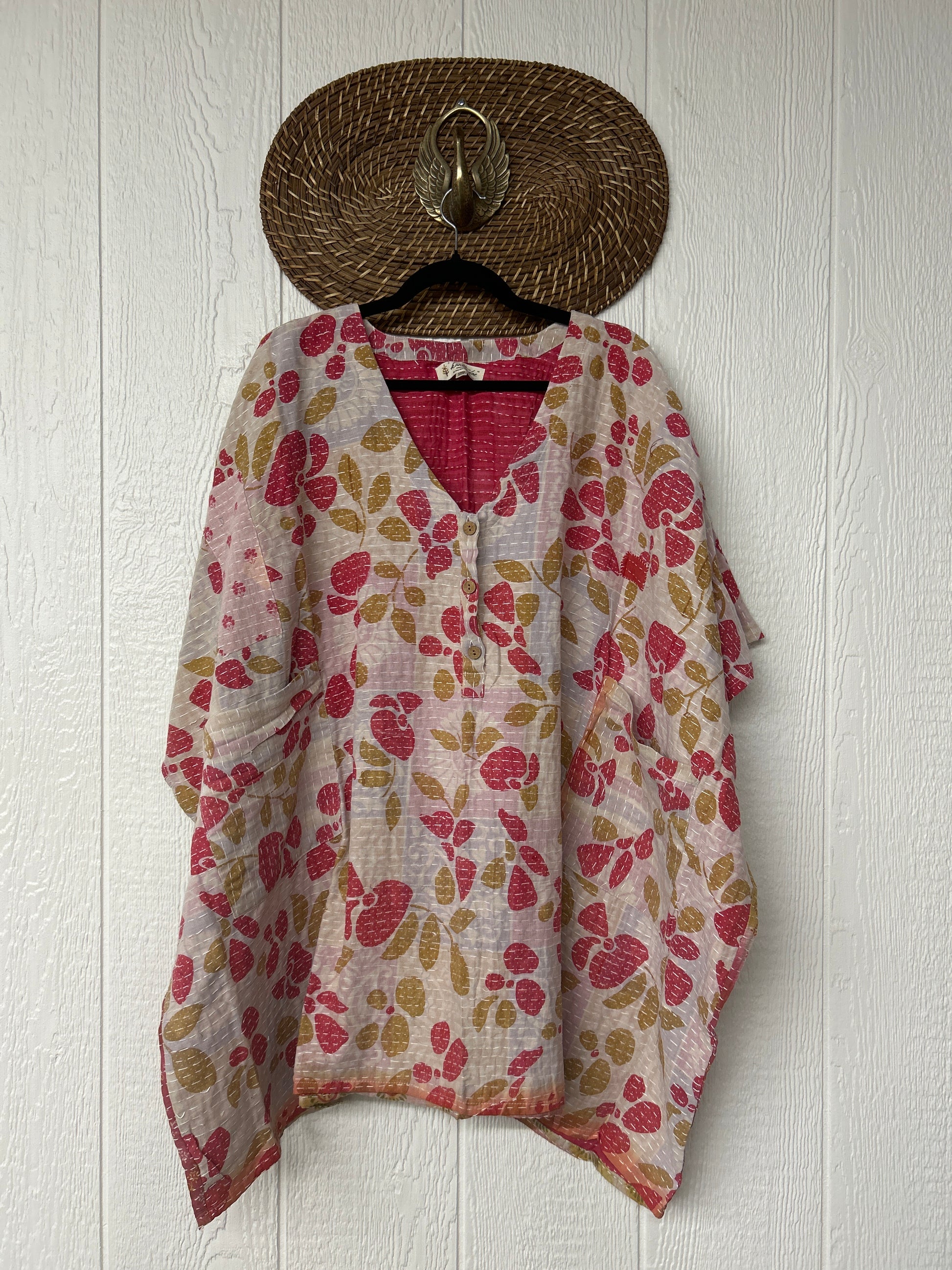 Crafted in our lux vintage kantha stitch cotton sari, this floaty muu is in a new mini length with buttons at the neckline and slouchy exterior pockets.