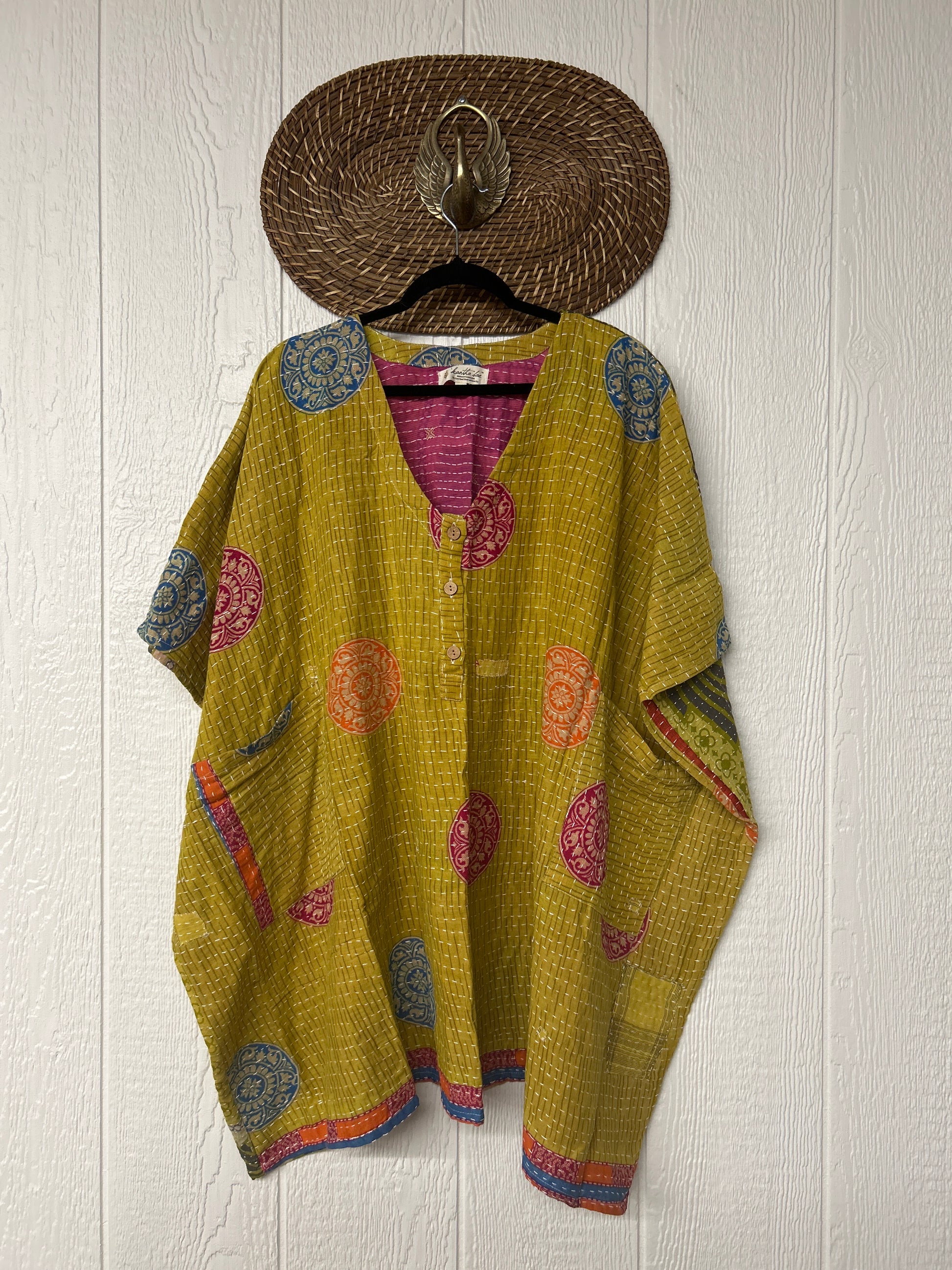 Crafted in our lux vintage kantha stitch cotton sari, this floaty muu is in a new mini length with buttons at the neckline and slouchy exterior pockets.
